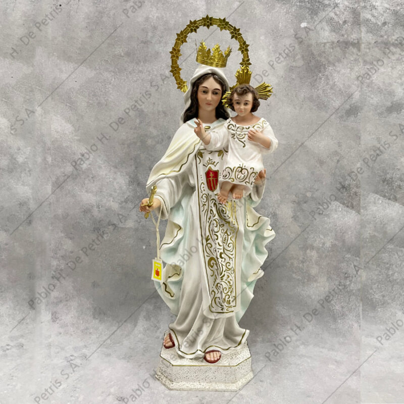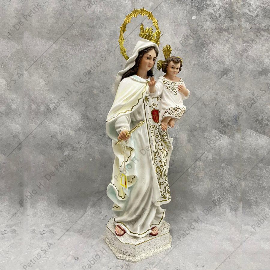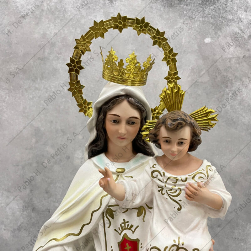 Imagen realizada en pasta. Pintada a mano al óleo en sus colores tradicionales. Ojos de cristal. Aureola de bronce.