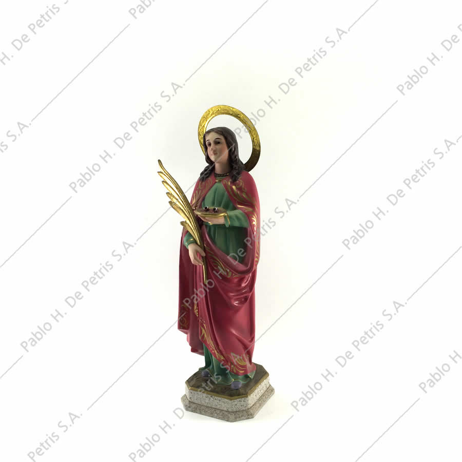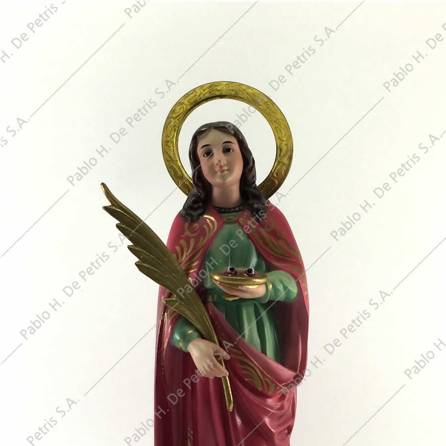 Imagen realizada en pasta. Pintada a mano al óleo en sus colores tradicionales. Ojos de cristal. Aureola de bronce.