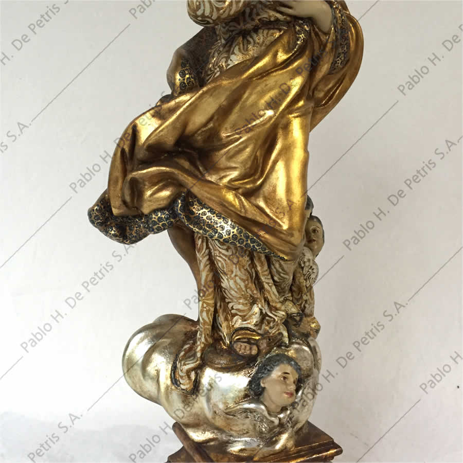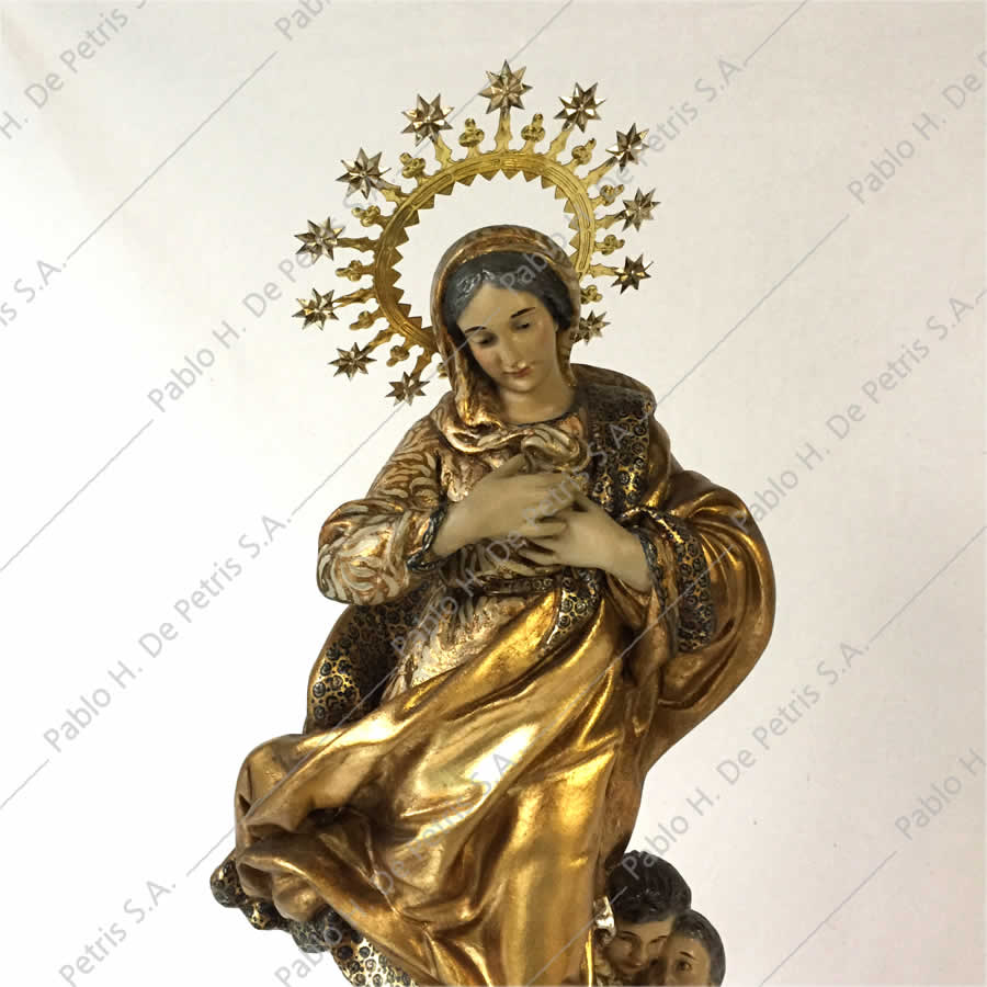 Imagen de estilo barroco. Realizada en pasta madera y decorada con la aplicación de la técnica de pan de oro. Ojos de cristal. Aureola de bronce.