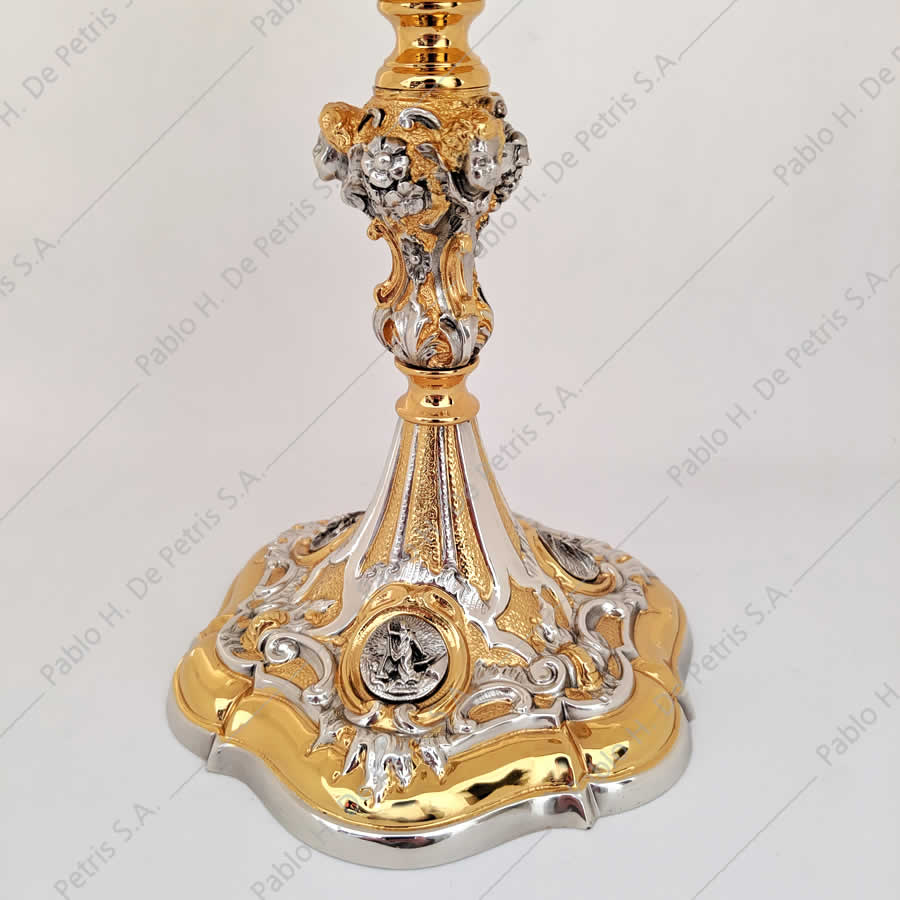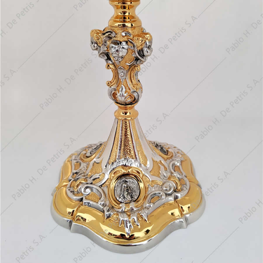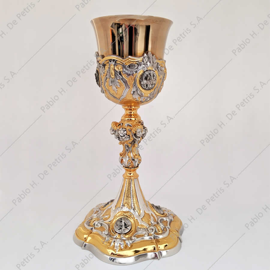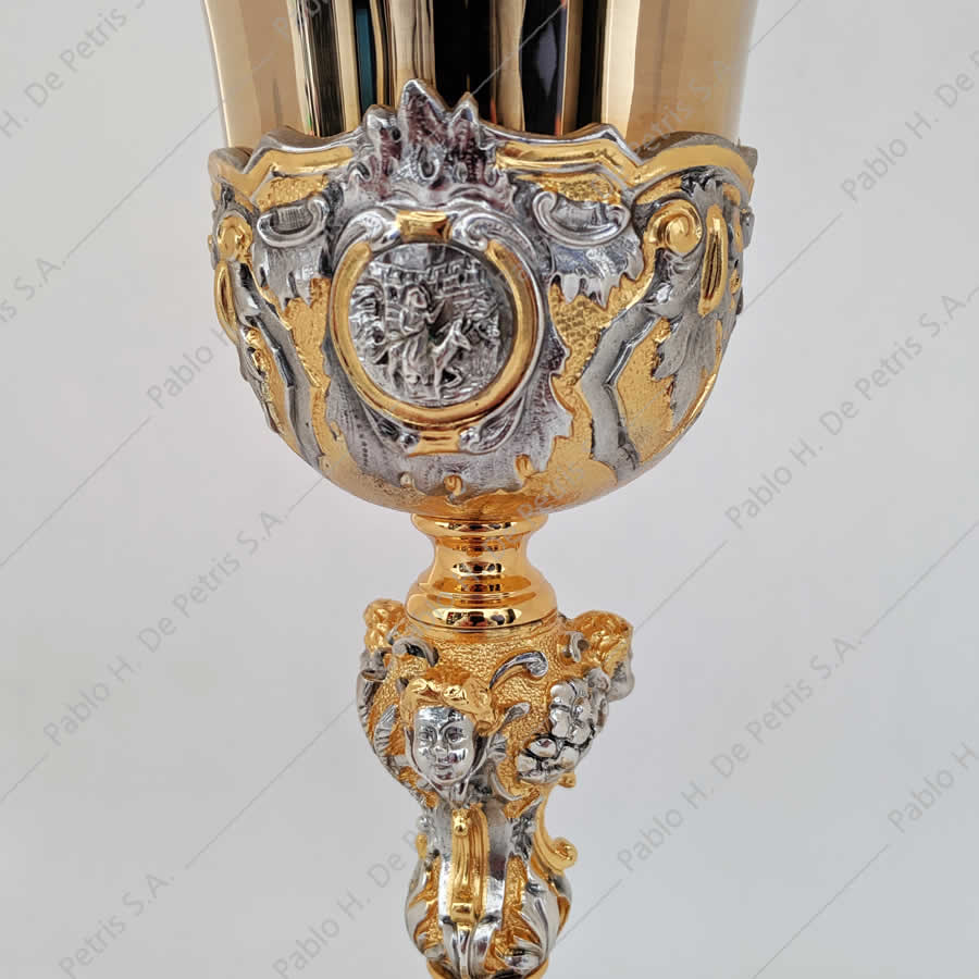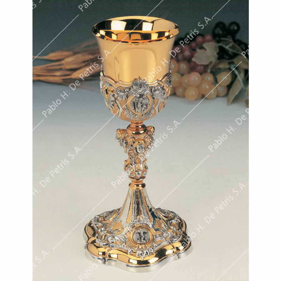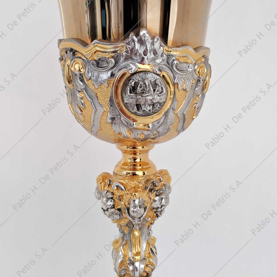 Cáliz con copa realizada en plata de ley. Interior bañado en oro. Exterior con baño de oro y plata según ornamentación. Nudo y pie de bronce bañado en oro y plata. Presenta rico trabajo con ángeles y apóstoles.