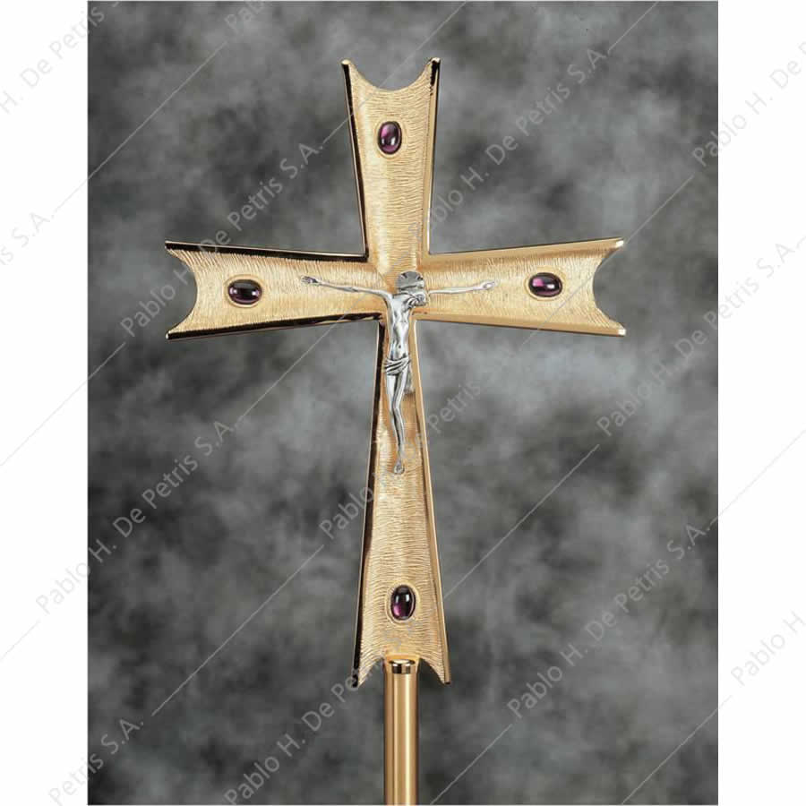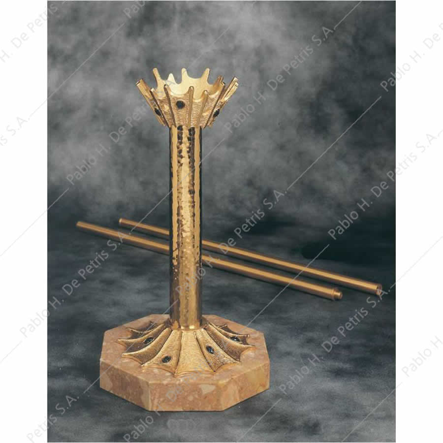 Realizada en bronce fundido bañada en oro con terminación satinada. Ornamentación de piedras duras color morado. Incluye base de apoyo.