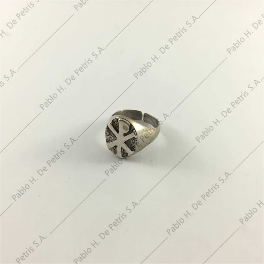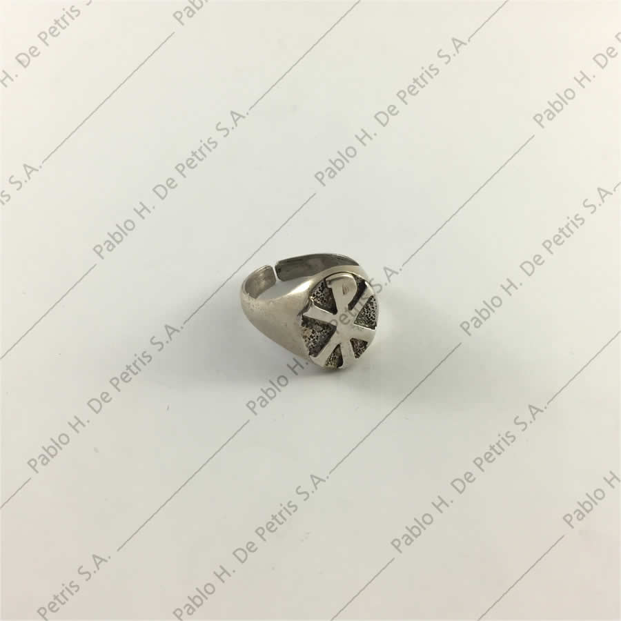 Anillo de manufactura nacional. Realizado en plata de ley, pulida a su color. Pax cincelado en el centro.