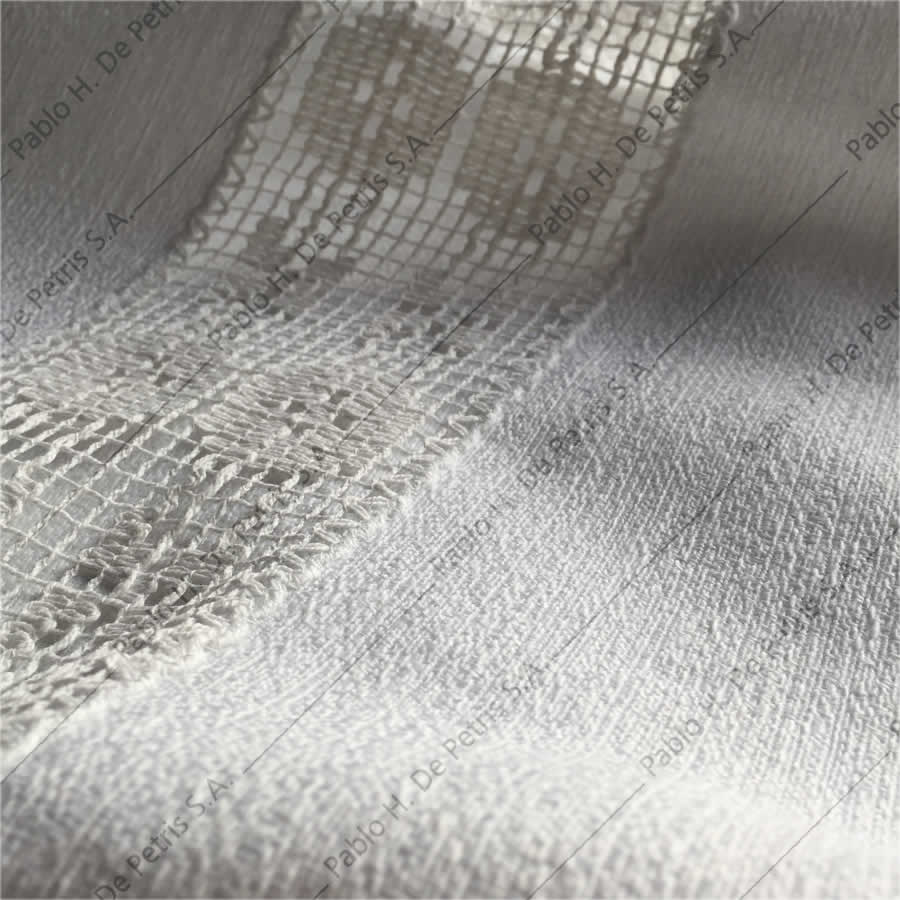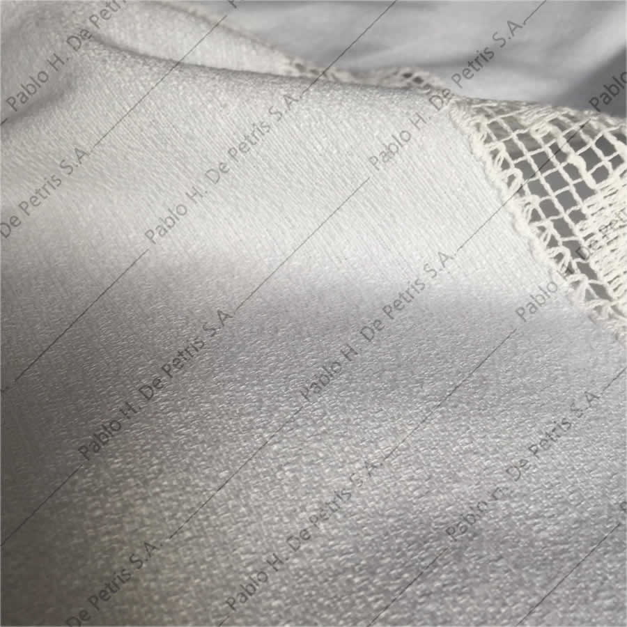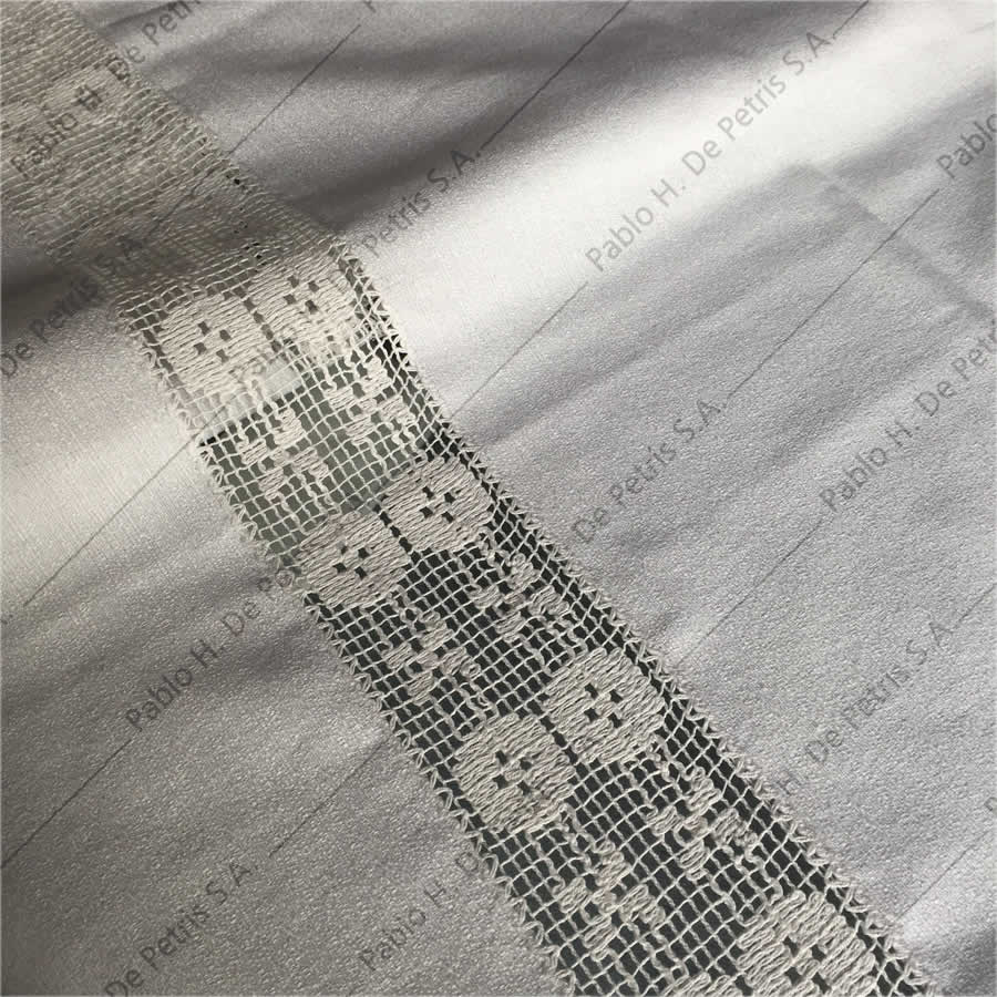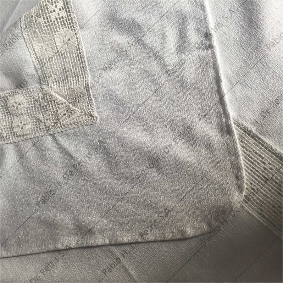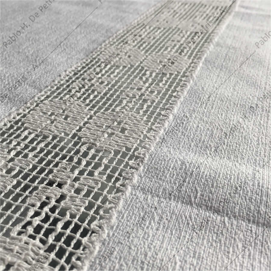 Mantel realizado en mezcla de tejido sintético y natural. Ornamentado con una delicada puntilla entre dos en todo el perímetro del mantel. Puntas redondeadas.