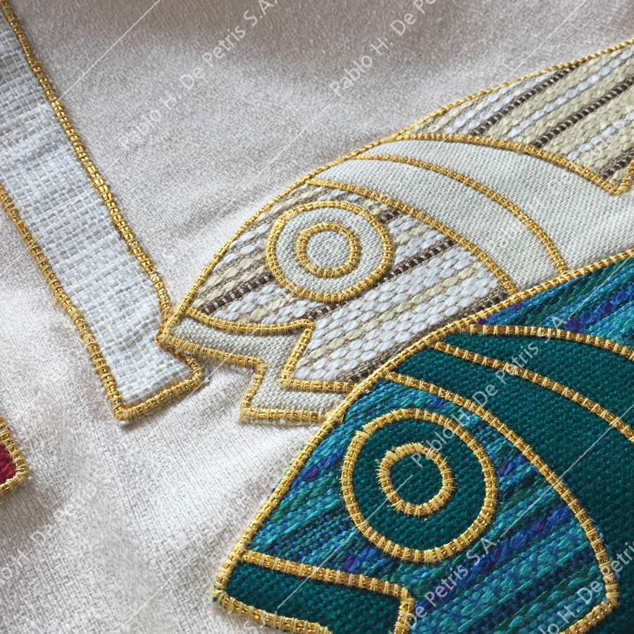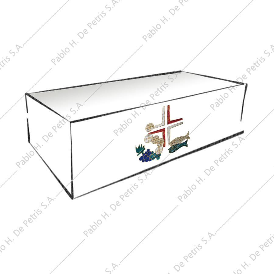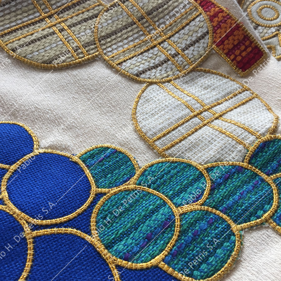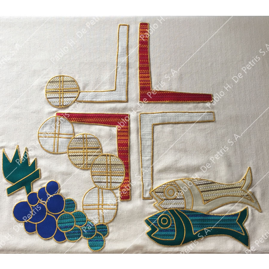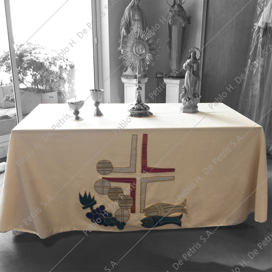 Mantel realizado en mezcla de tejido sintético y natural. Frente ornamentado con importante aplique.