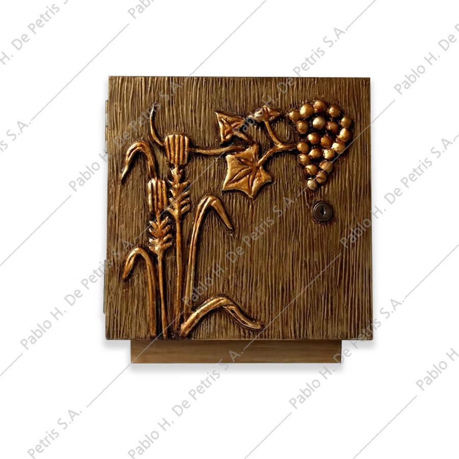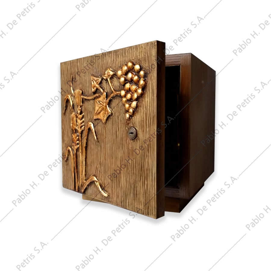 Realizado en madera. Ornamentación, realizada a mano, en el frente. Interior revestido en bronce pulido o bañado en oro.
