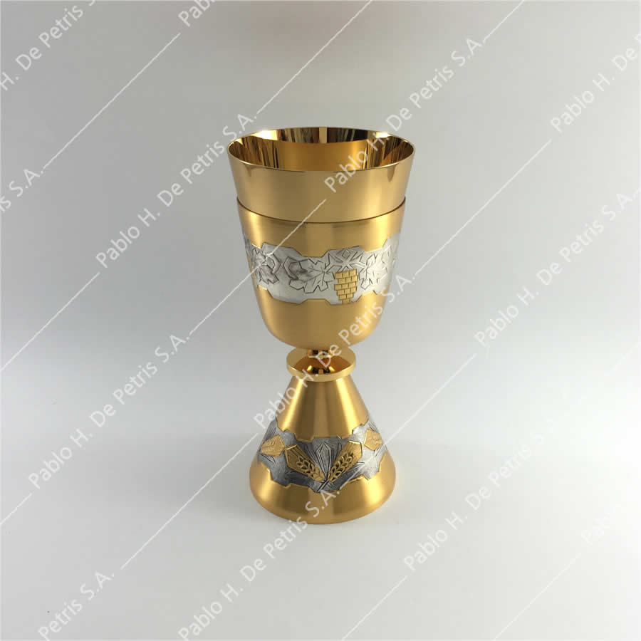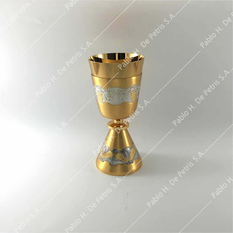 Cáliz realizado en bronce con baño interior y exterior de oro con dos bandas cinceladas bañadas en plata.