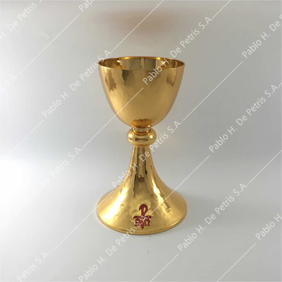 Cáliz realizado en bronce bañado en su interior y exterior en oro. Ornamentación al pie con símbolos Alfa, Omega y Rho esmaltados a fuego.