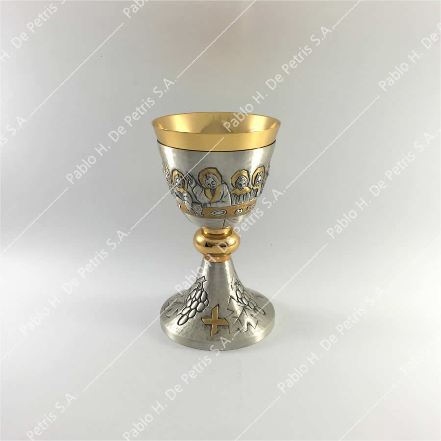 Cáliz realizado en bronce, con baño interior en oro y baño exterior de plata. Ornamentación en martelé y escena de la Última Cena en relieve acabada en oro y plata.