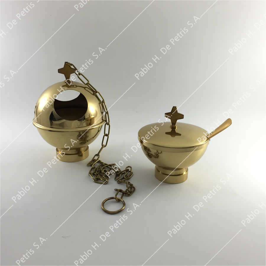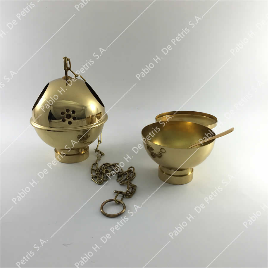 Conjunto de manufactura italiana. Realizado en bronce pulido. La tapa del incensario no se separa de la base y contiene una sola cadena.