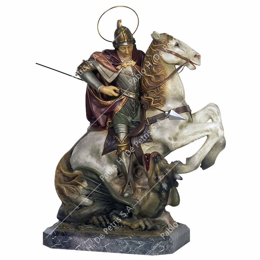 Imagen realizada en pasta madera. Pintada a mano al óleo en sus colores tradicionales. Ojos de cristal. Aureola de bronce.