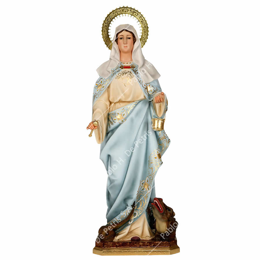 Imagen realizada en pasta madera. Pintada a mano al óleo en sus colores tradicionales. Ojos de cristal. Aureola de bronce.
