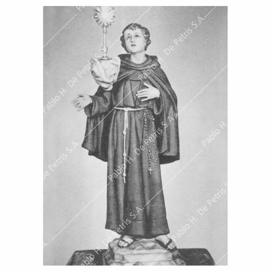 Imagen realizada en pasta madera. Pintada a mano al óleo en sus colores tradicionales. Ojos de cristal. Aureola de bronce.