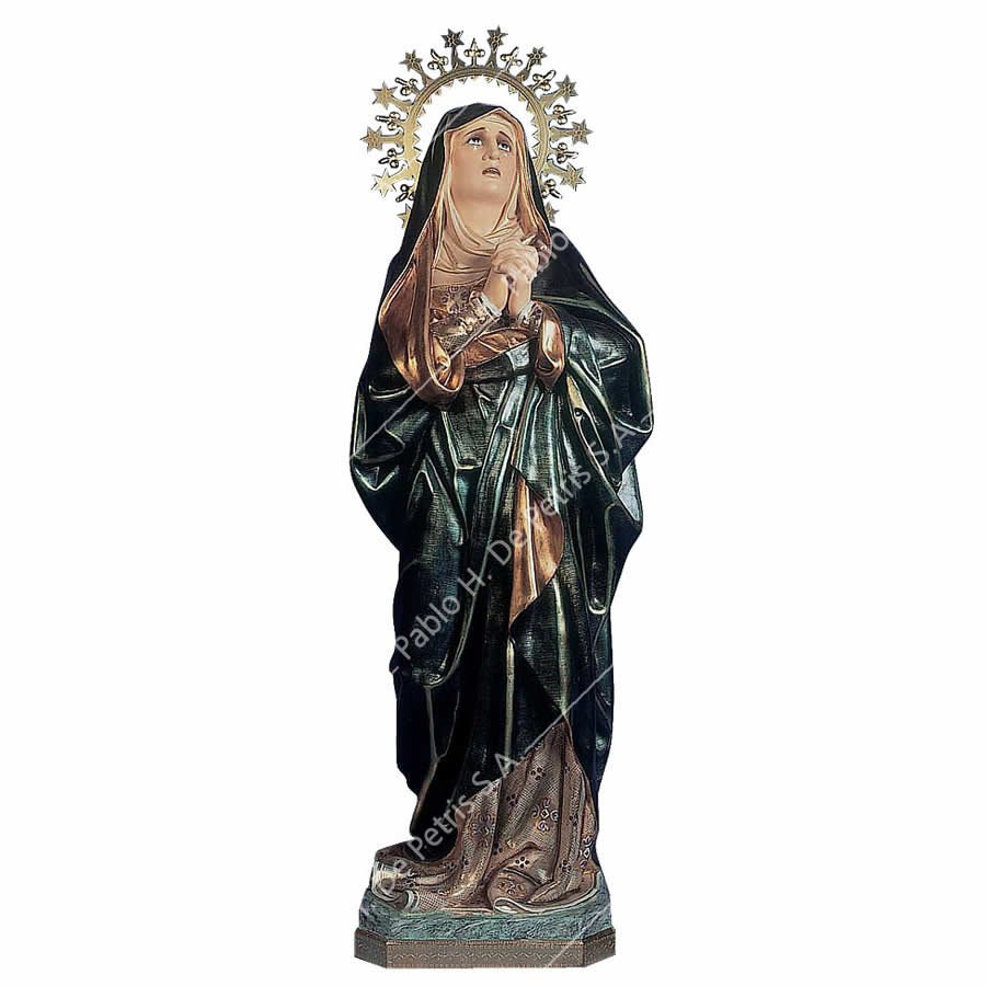 Imagen realizada en pasta madera y pintada a mano al óleo es sus colores tradicionales. Incluye ojos de cristal y aureola de bronce.