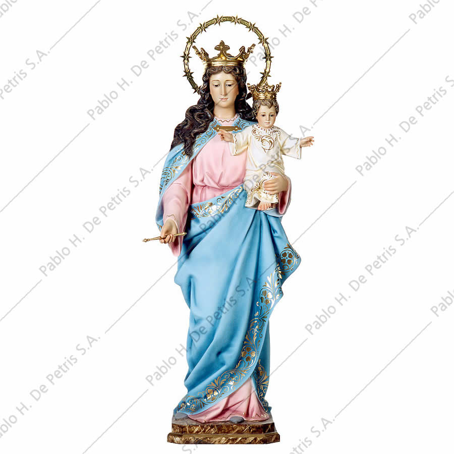 Imagen realizada en pasta madera y pintada a mano al óleo en sus colores tradicionales. Ojos de cristal. Aureola de bronce.