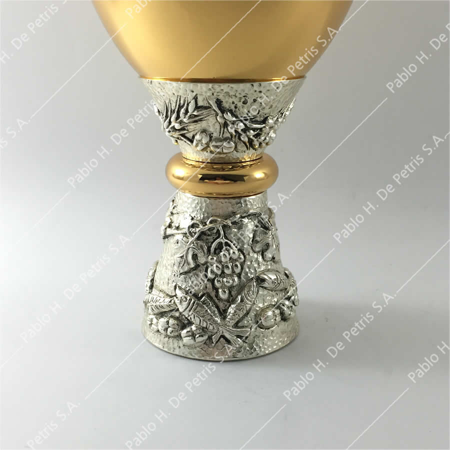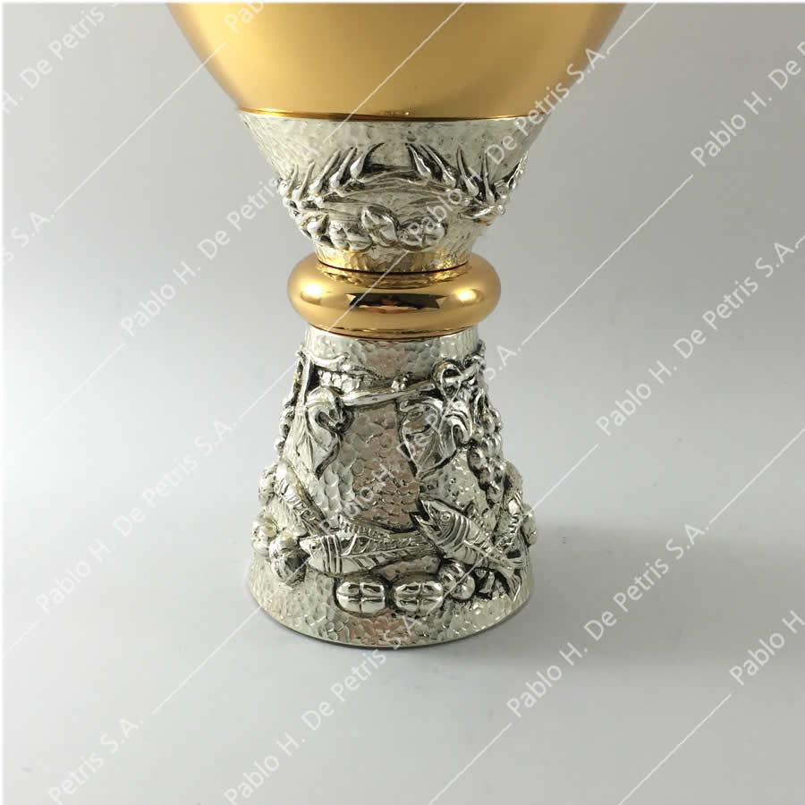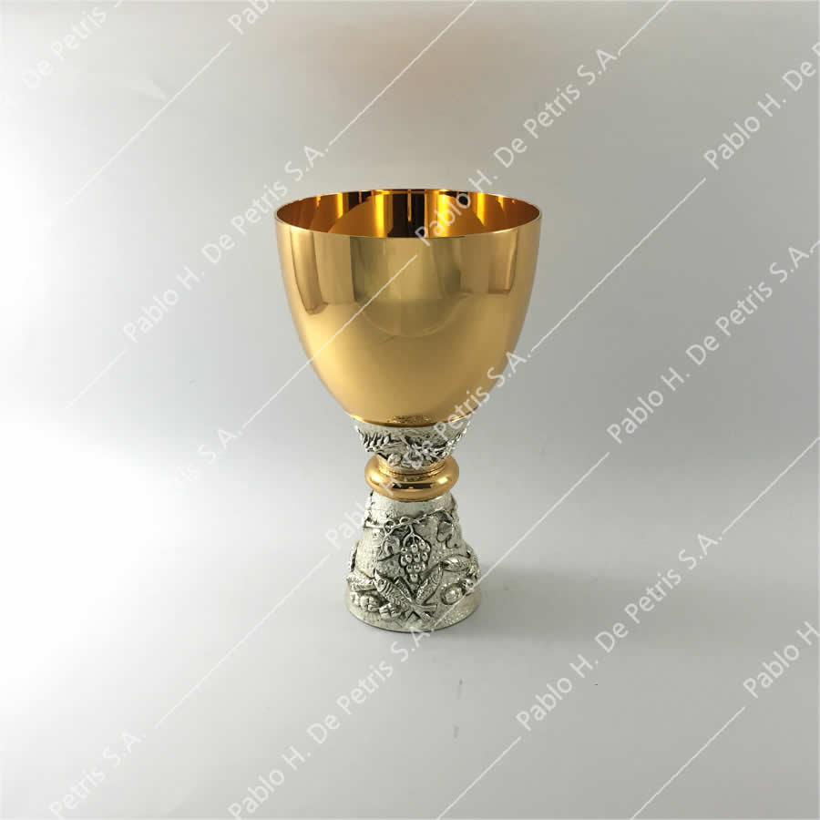 Cáliz realizado en bronce con copa y nudo bañados en oro. Pie bañado en plata. Ornamentación al pie con relieve de peces, uvas y trigo.