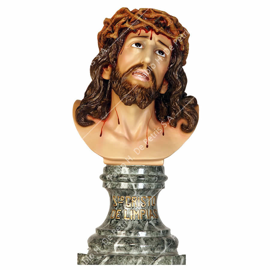 Imagen realizada en pasta madera. Pintada a mano al óleo en sus colores tradicionales. Ojos de cristal. Aureola de bronce.