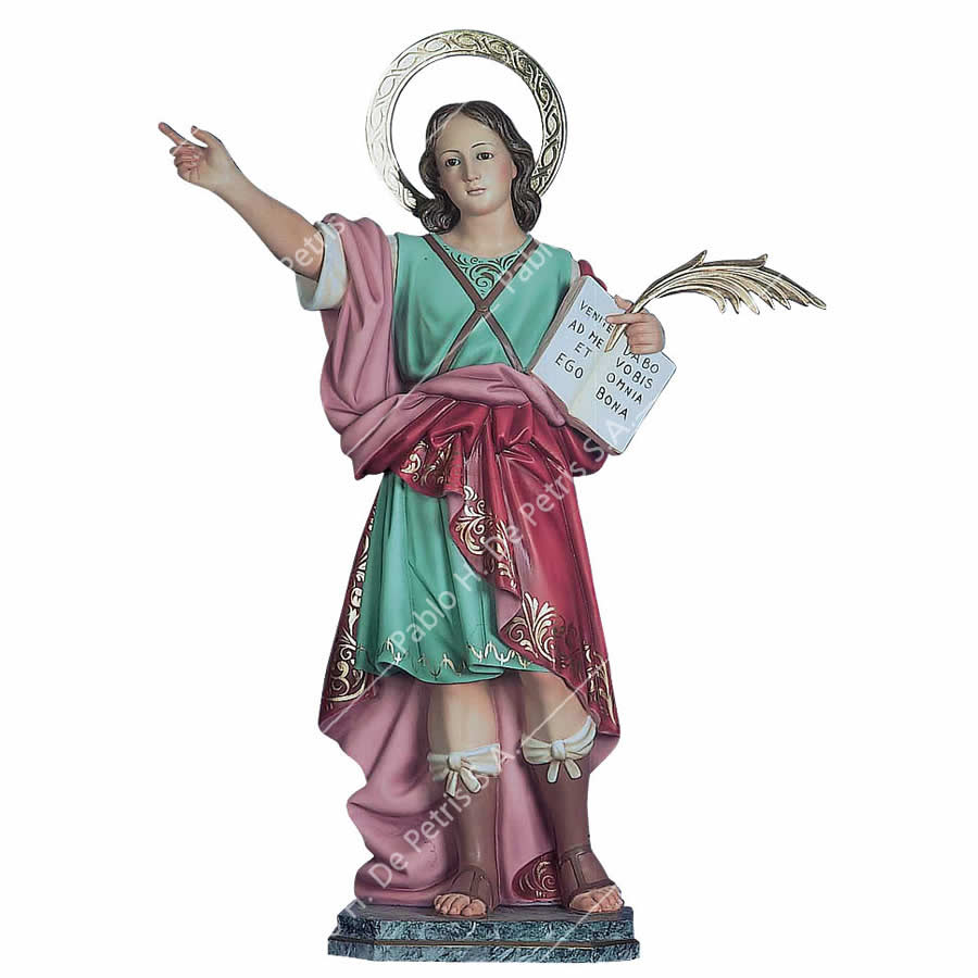 Imagen realizada en pasta madera. Pintada a mano al óleo en sus colores tradicionales. Ojos de cristal. Aureola de bronce.