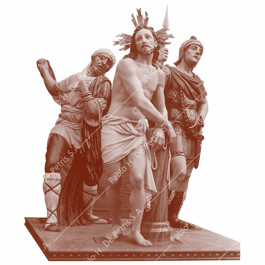 Conjunto de 3 figuras realizadas en pasta madera. Pintadas a mano al óleo en sus colores tradicionales. Ojos de cristal. Aureola de bronce.