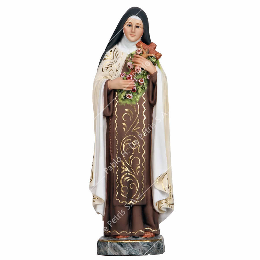 Imagen realizada en pasta madera. Pintada a mano al óleo en sus colores tradicionales. Ojos de cristal. Aureola de bronce.