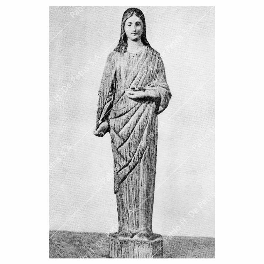 Imagen realizada en pasta madera y pintada a mano al óleo en sus colores tradicionales. Ojos de cristal. Aureola de bronce.