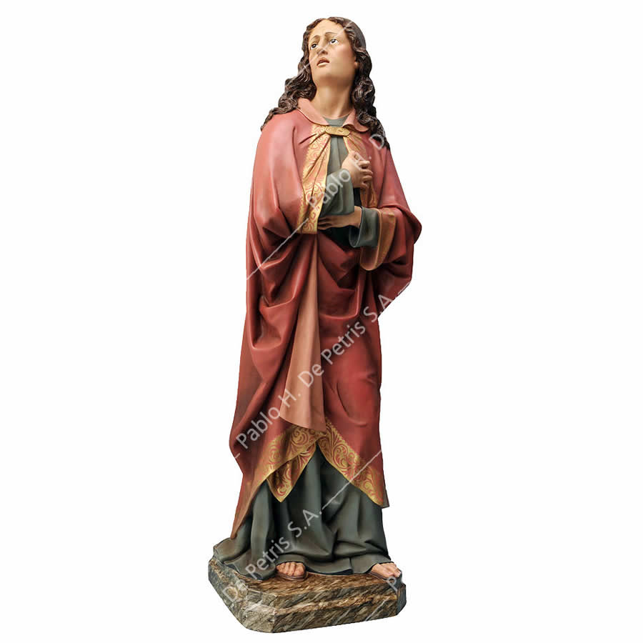 Imagen realizada en pasta madera y pintada a mano al óleo en sus colores tradicionales. Ojos de cristal. Aureola de bronce.