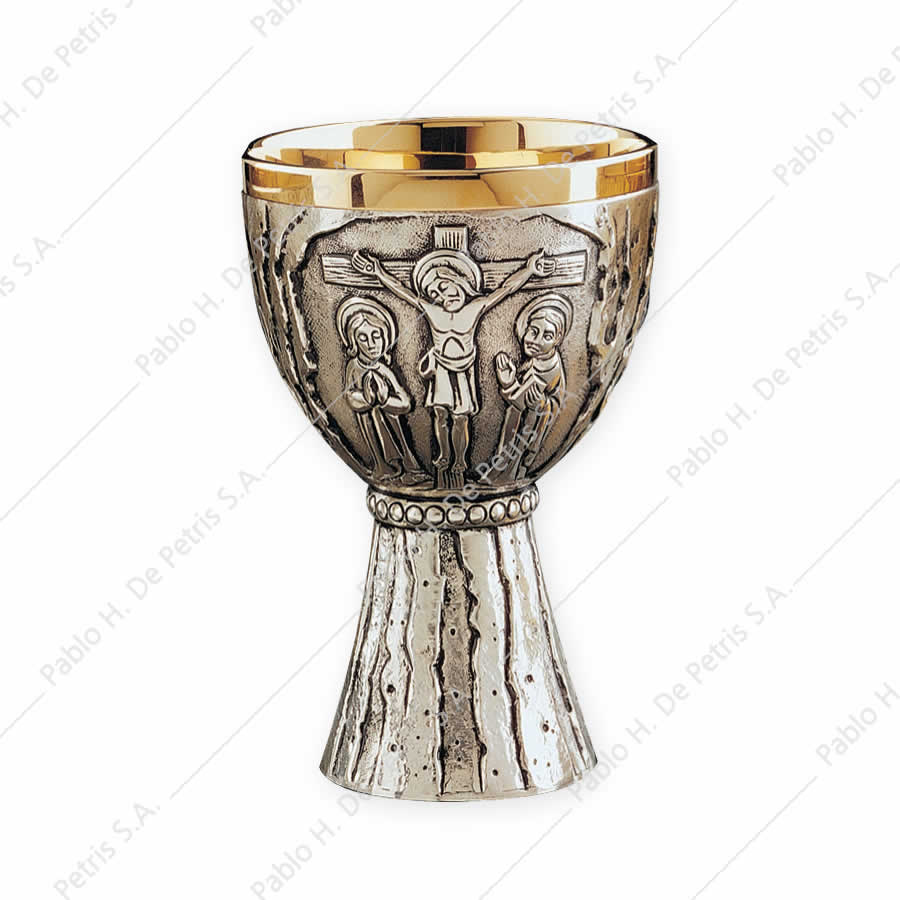 Cáliz realizado en bronce con baño interior de oro y exterior de plata. Motivo de la crucifixión.
