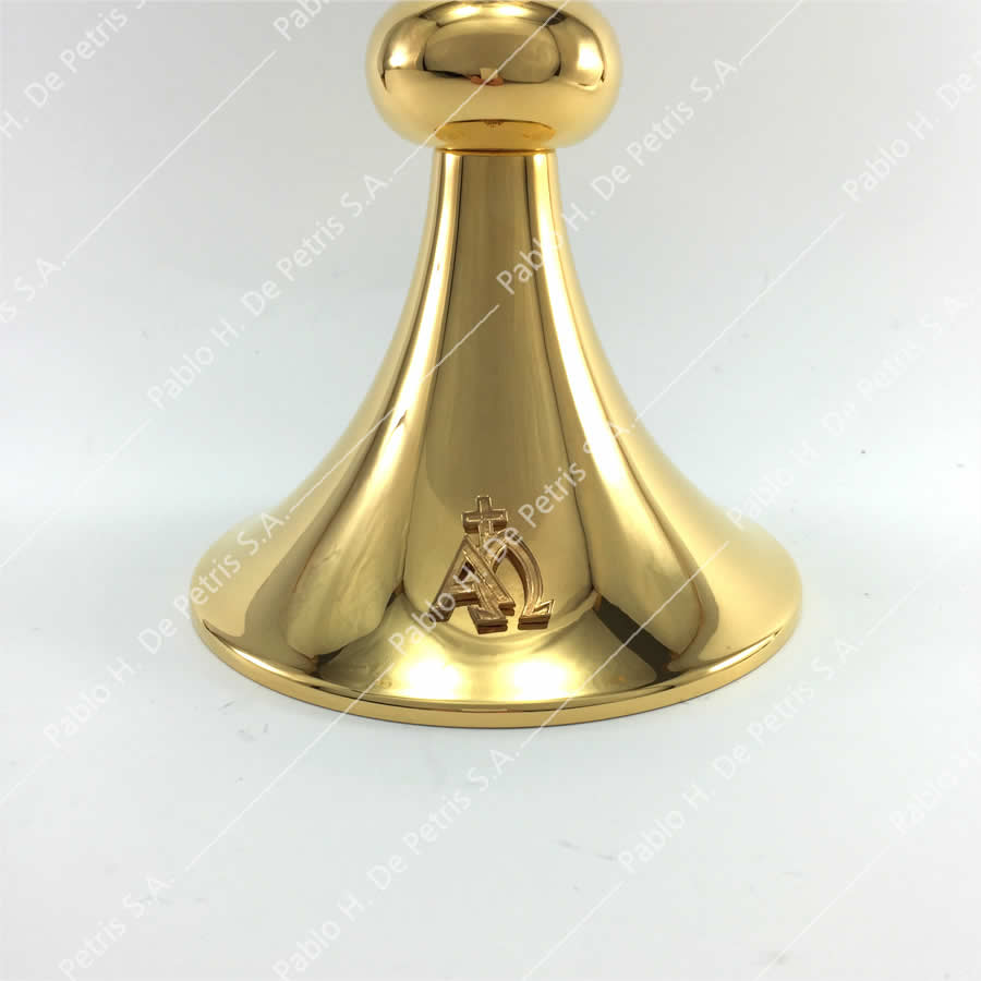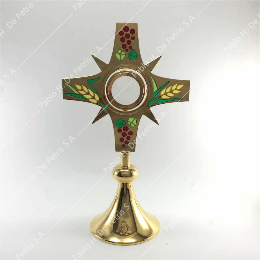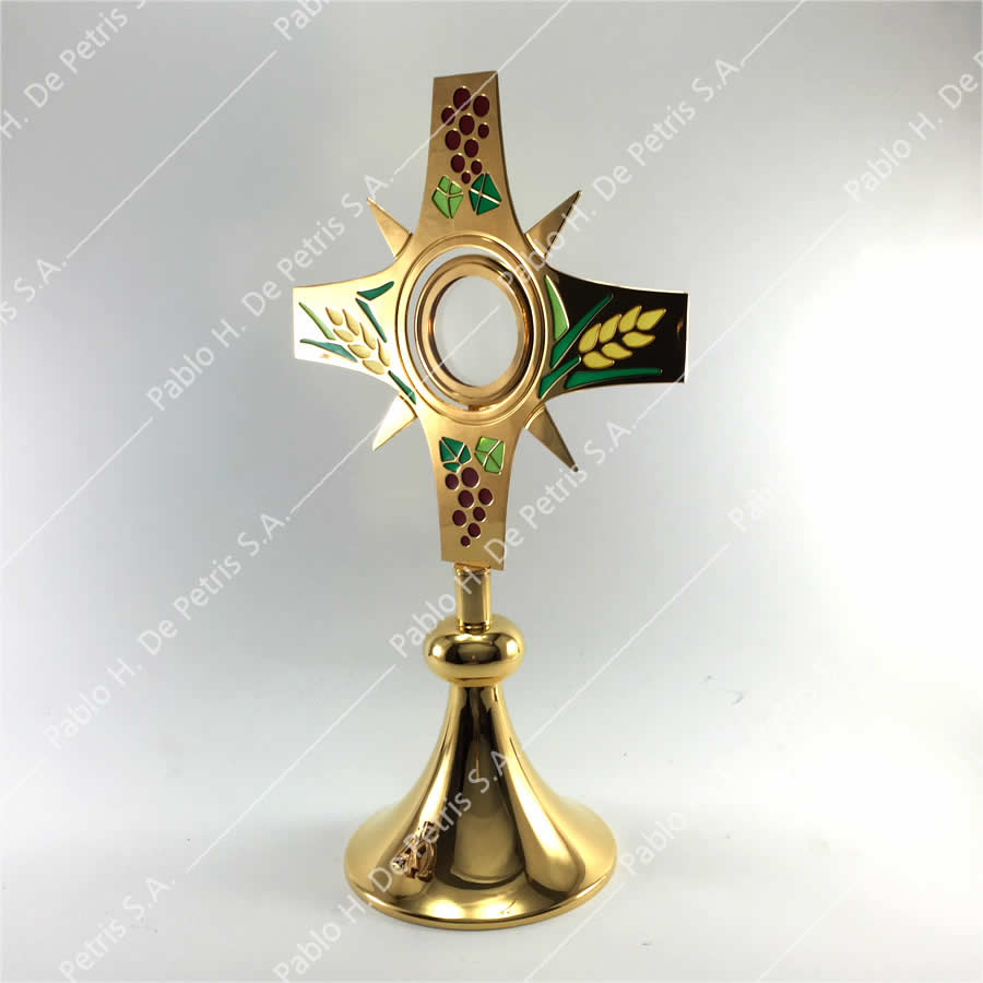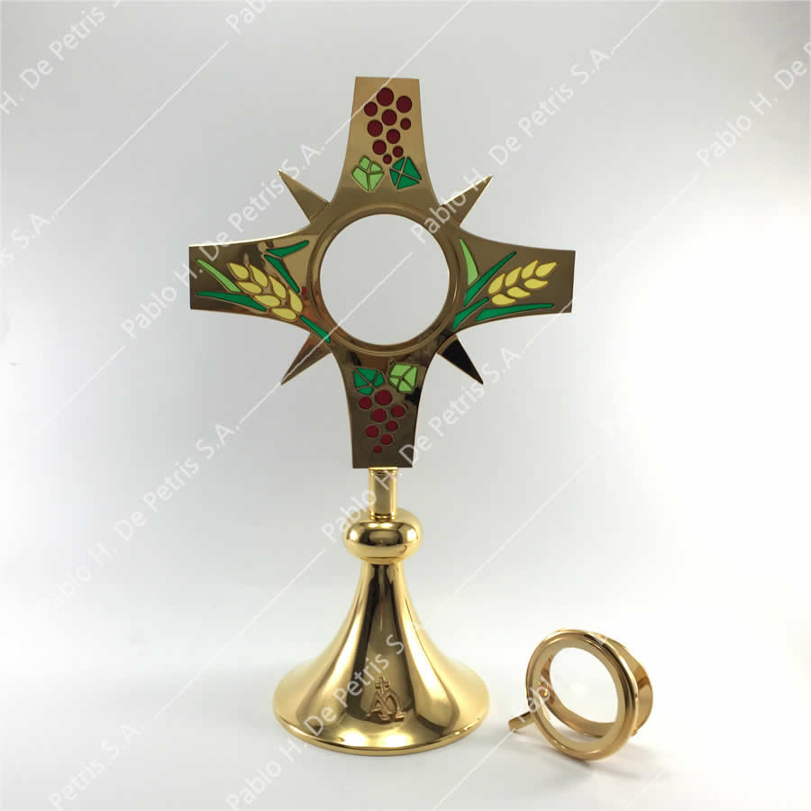 Realizada en bronce con interior y exterior bañados en oro. Ornamentación esmaltada a fuego. Viril bañado en oro, removible para poder transportarlo.