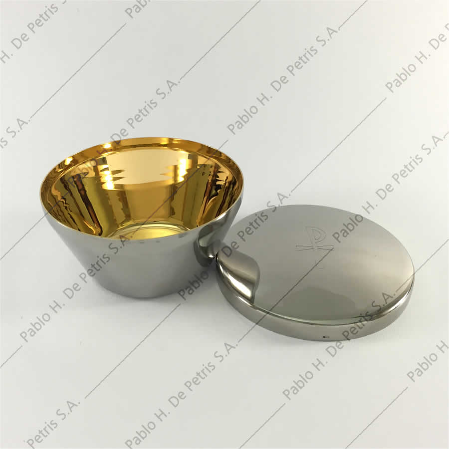 Realizado en bronce con baño interior en oro y exterior en plata. Tapa con diseño cincelado.