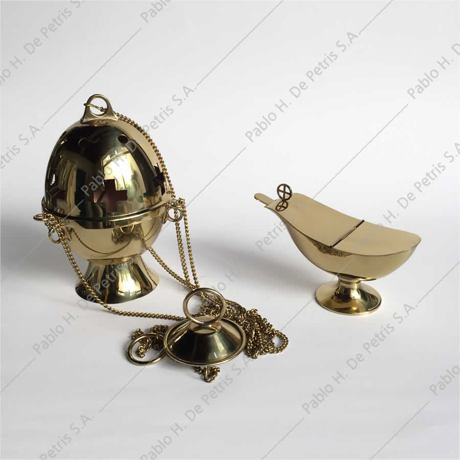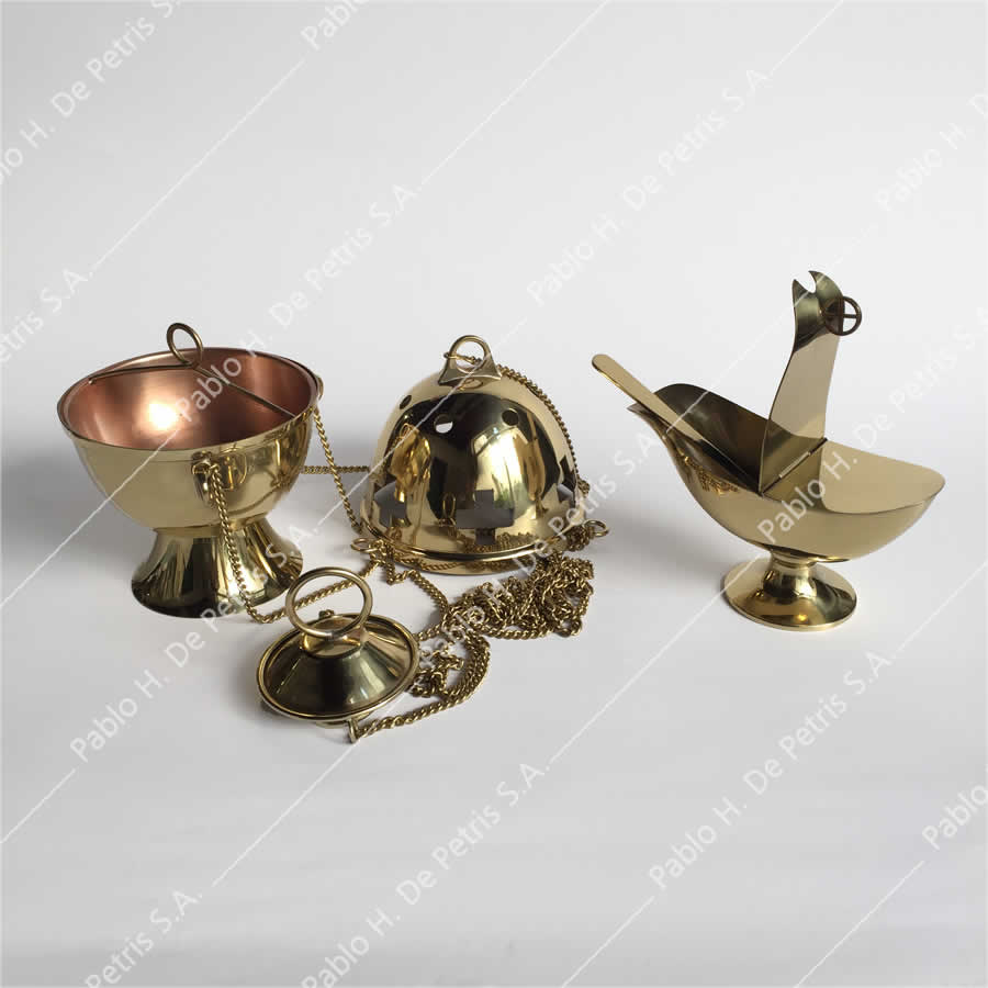 Conjunto de manufactura española. Realizado en bronce pulido. Tapa del incensario con cuatro cadenas.