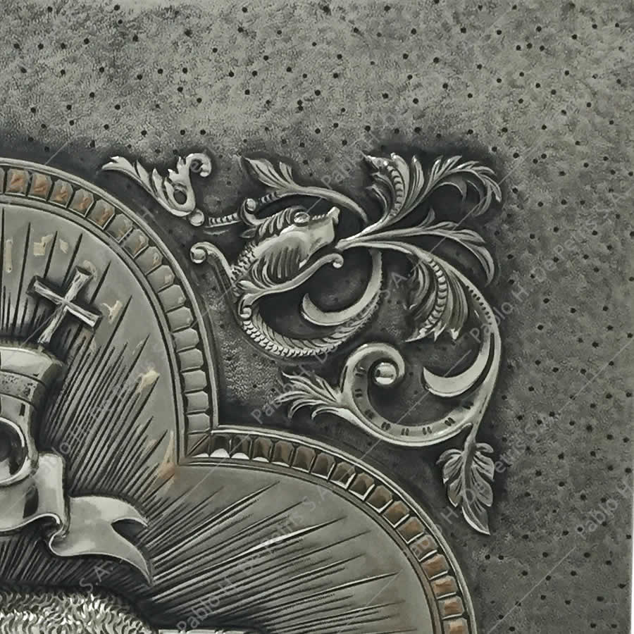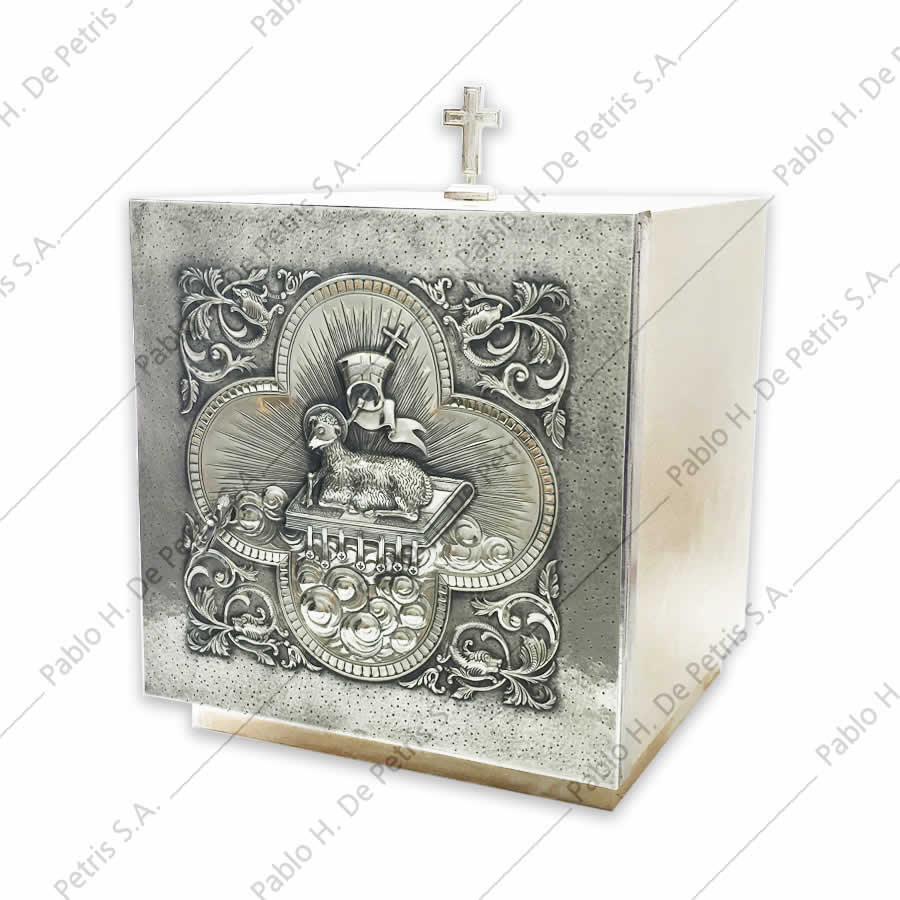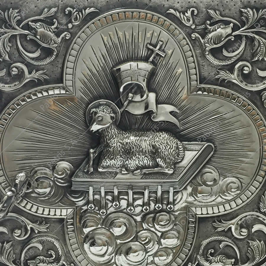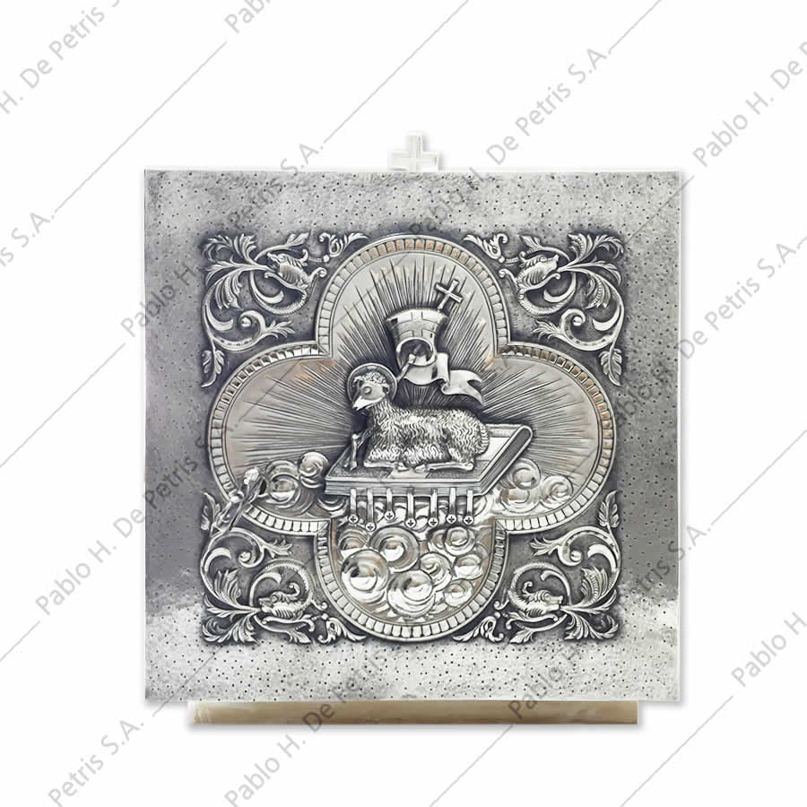 Realizado en bronce. Interior bañado en oro. Exterior bañado en plata. Frente con clásico diseño del Agnus Dei con finos detalles de terminación.