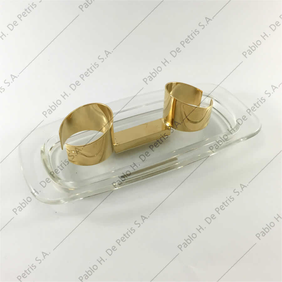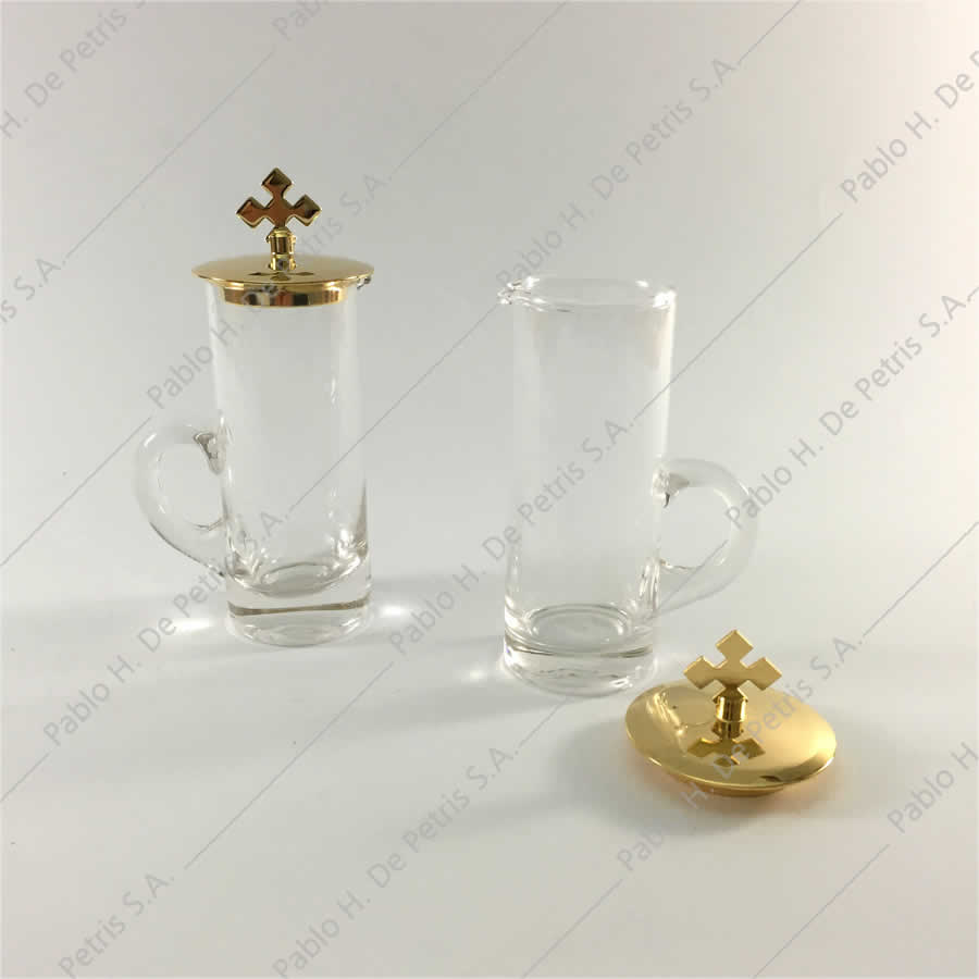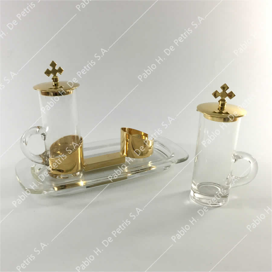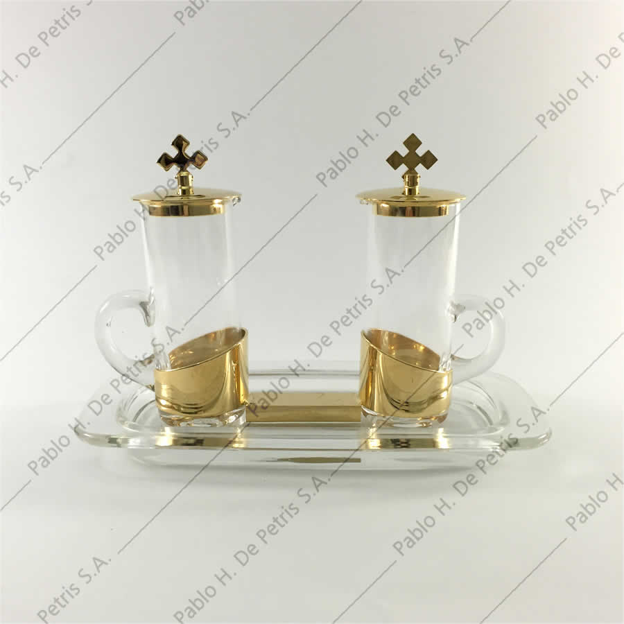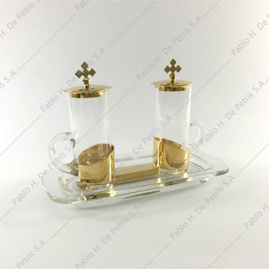 Conjunto de manufactura italiana con envases de vidrio. Bandeja de vidrio con soporte de bronce bañado en oro para las vinajeras. Tapas de bronce bañado en oro.