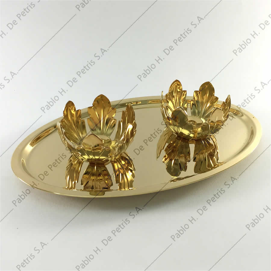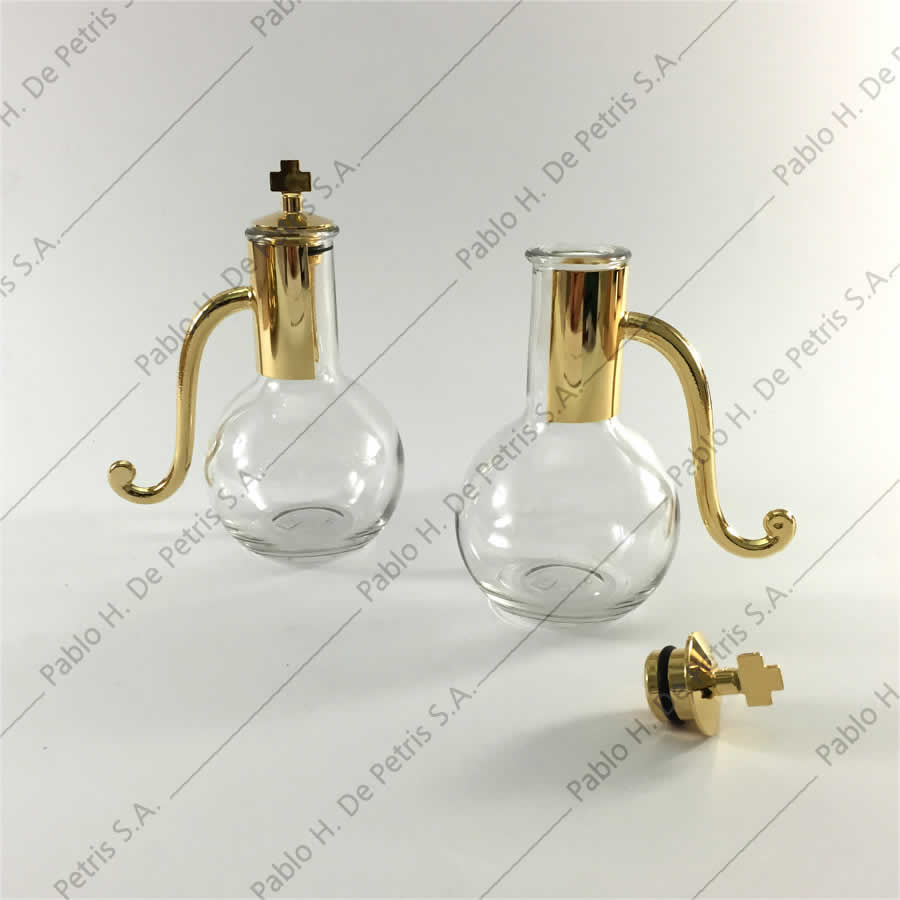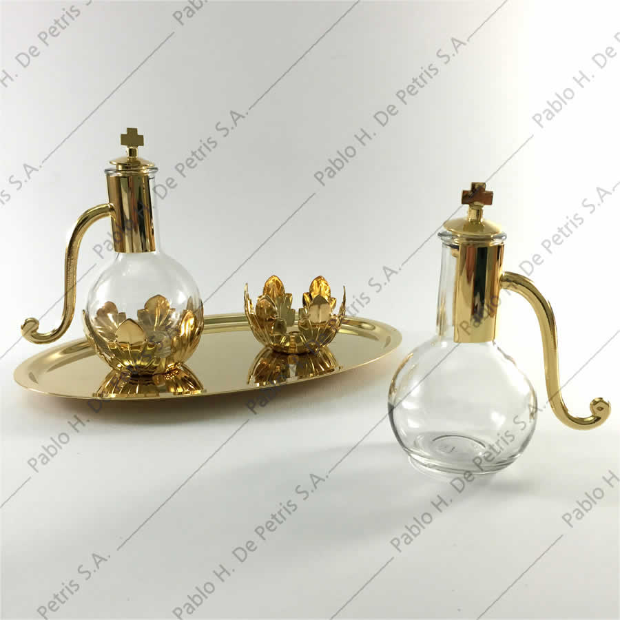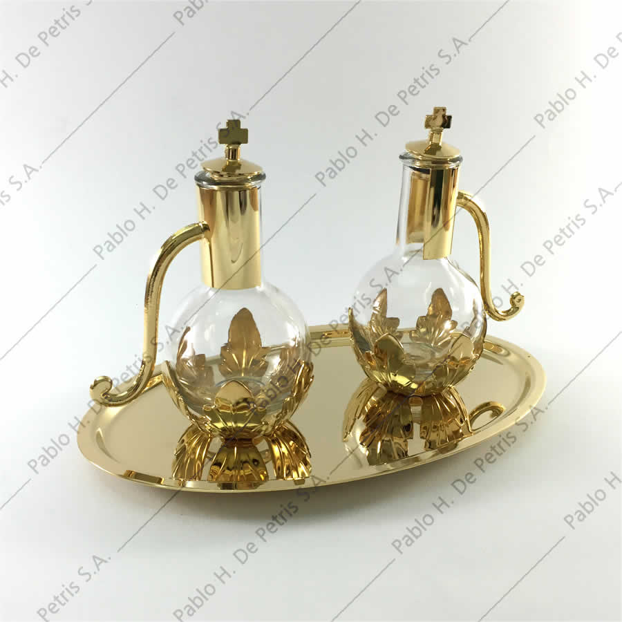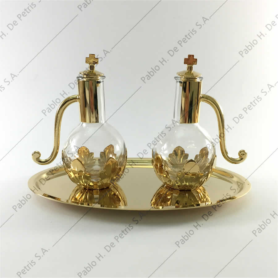 Conjunto de manufactura italiana con envases de vidrio con asa y tapa de bronce bañado en oro. Bandeja de bronce bañado en oro con soporte para las vinajeras.