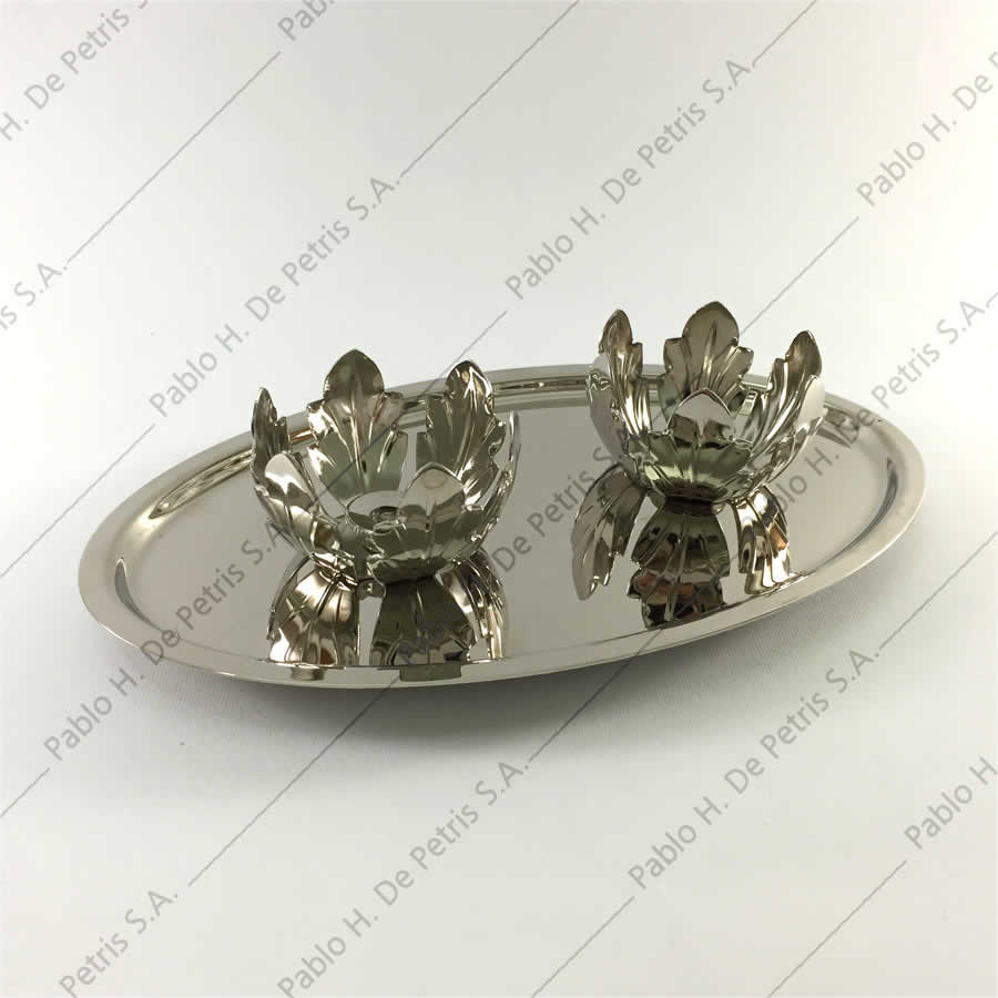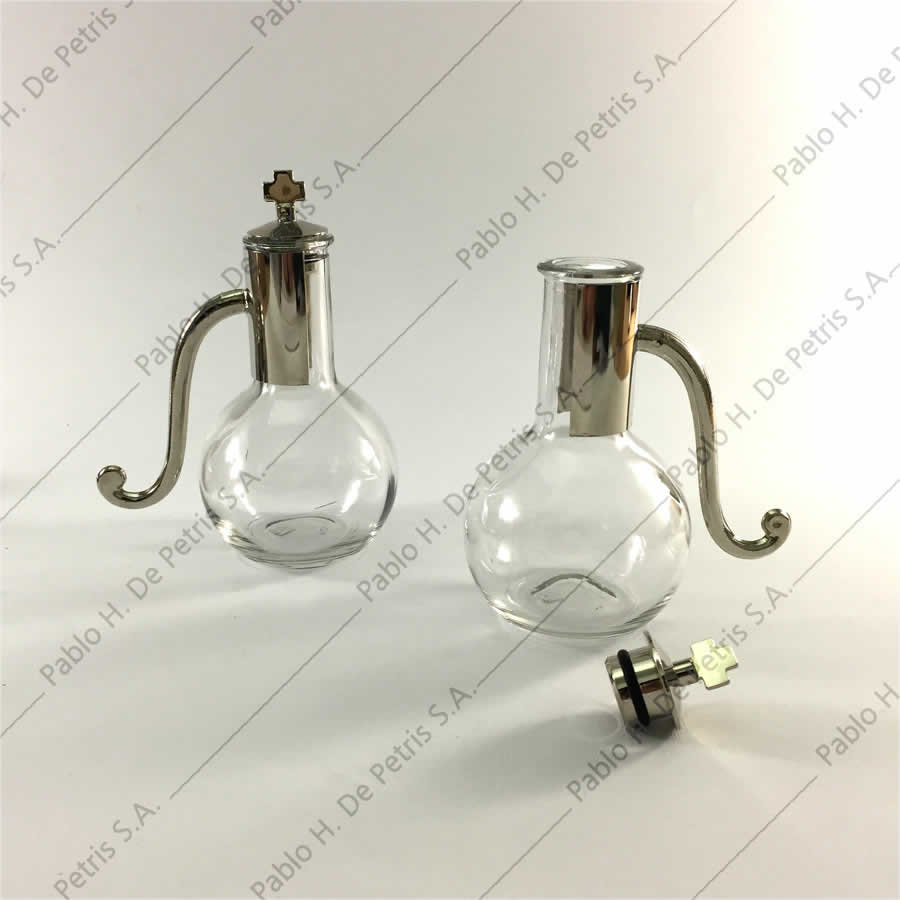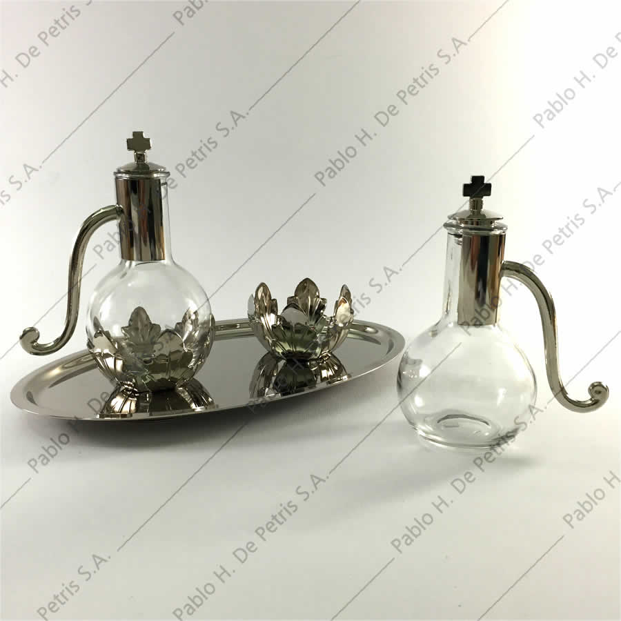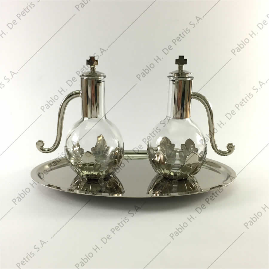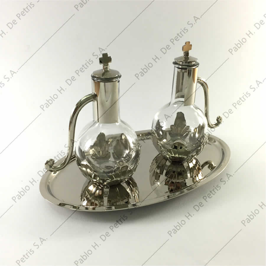 Conjunto de manufactura italiana con envases de vidrio con asa y tapa de bronce bañado niquelado. Bandeja de bronce niquelado con soporte para las vinajeras.