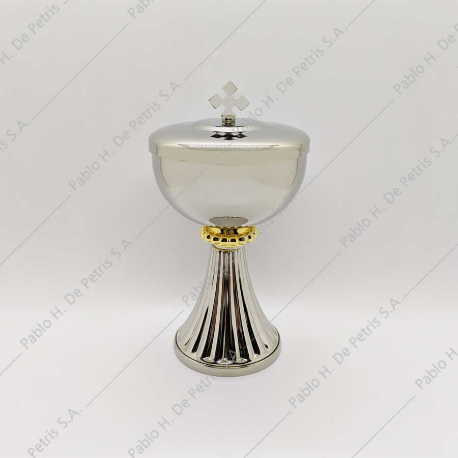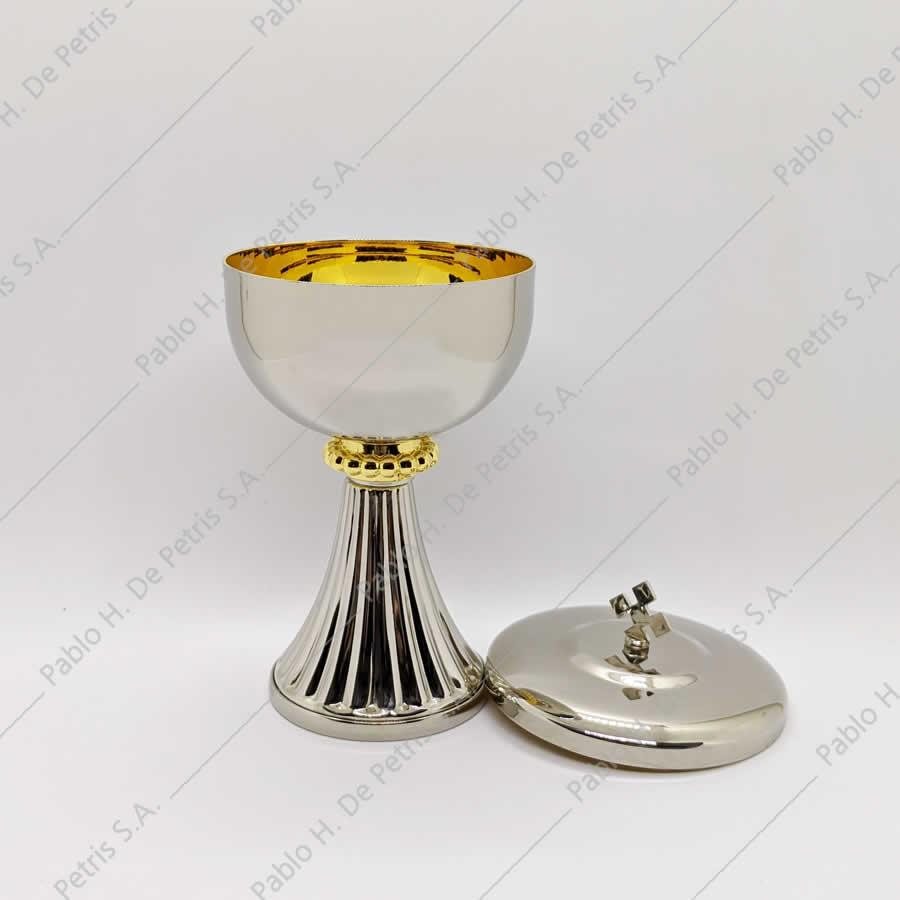 Realizado en bronce. Baño interior y nudo en oro. Copa, tapa y pie niquelados.