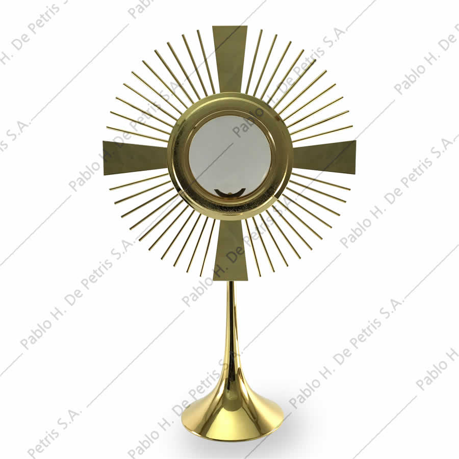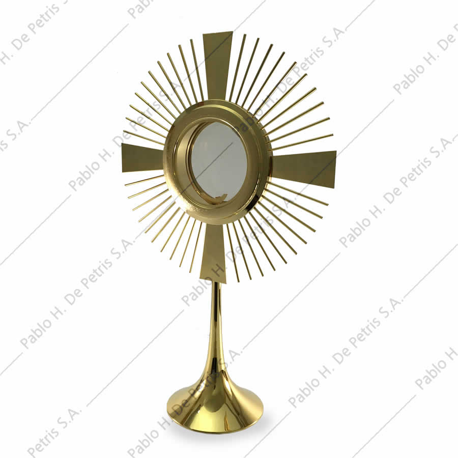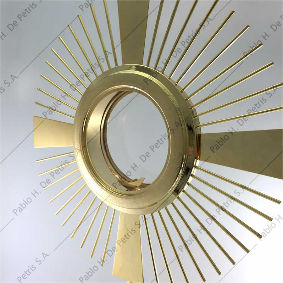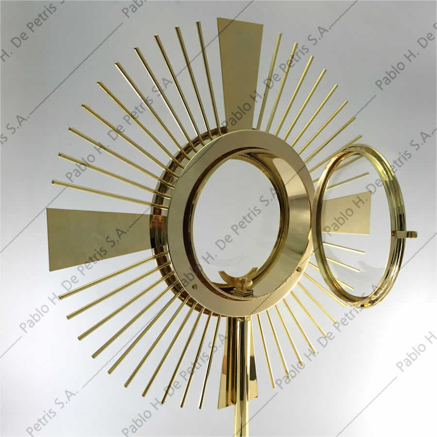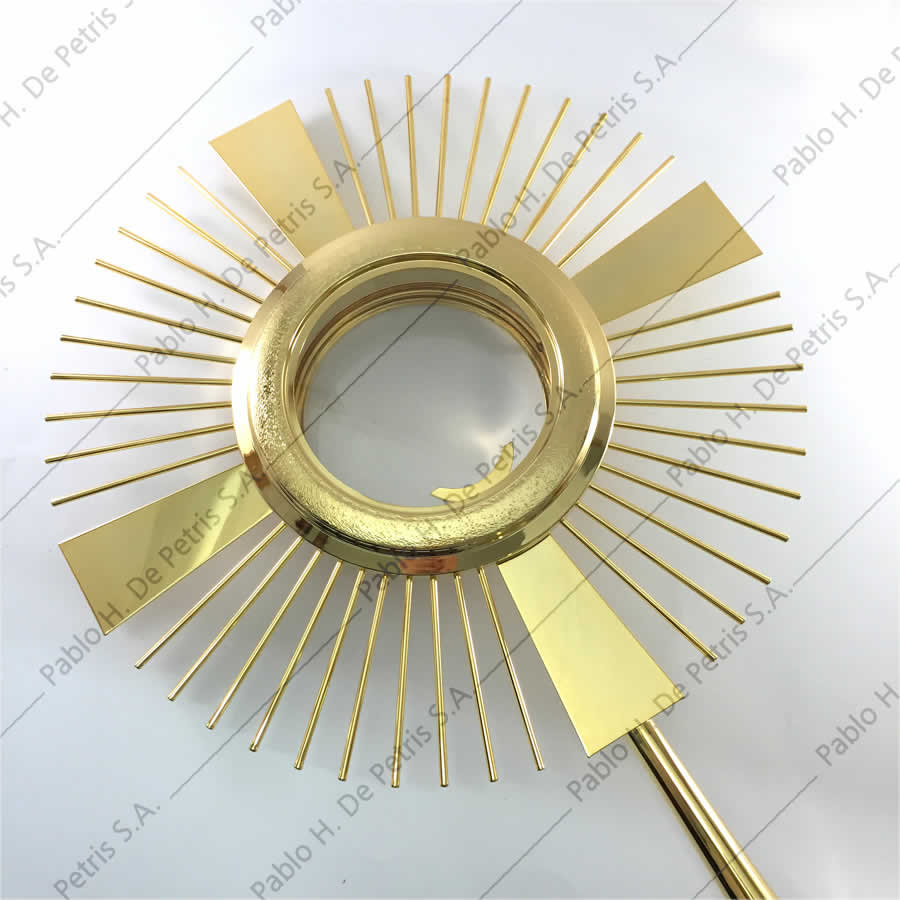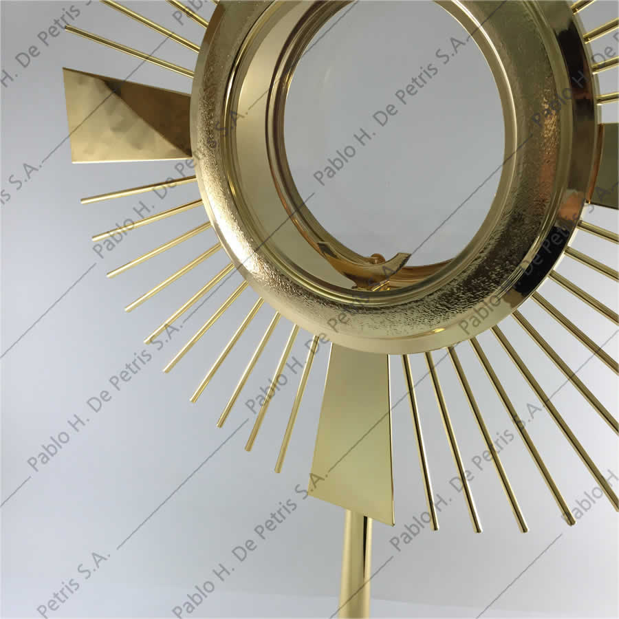 Realizada en bronce bañada en oro. Viril bañado en oro, removible para poder transportarlo. Apta para hostia de hasta 15 cm. de diámetro.