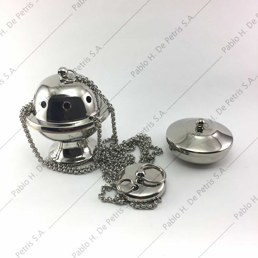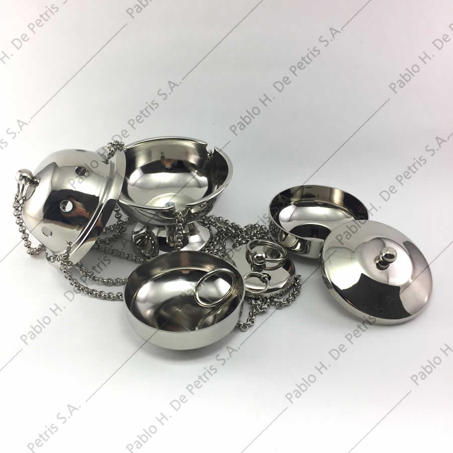 Conjunto de manufactura italiana. Realizado en bronce niquelado. Tapa del incensario con cuatro cadenas.