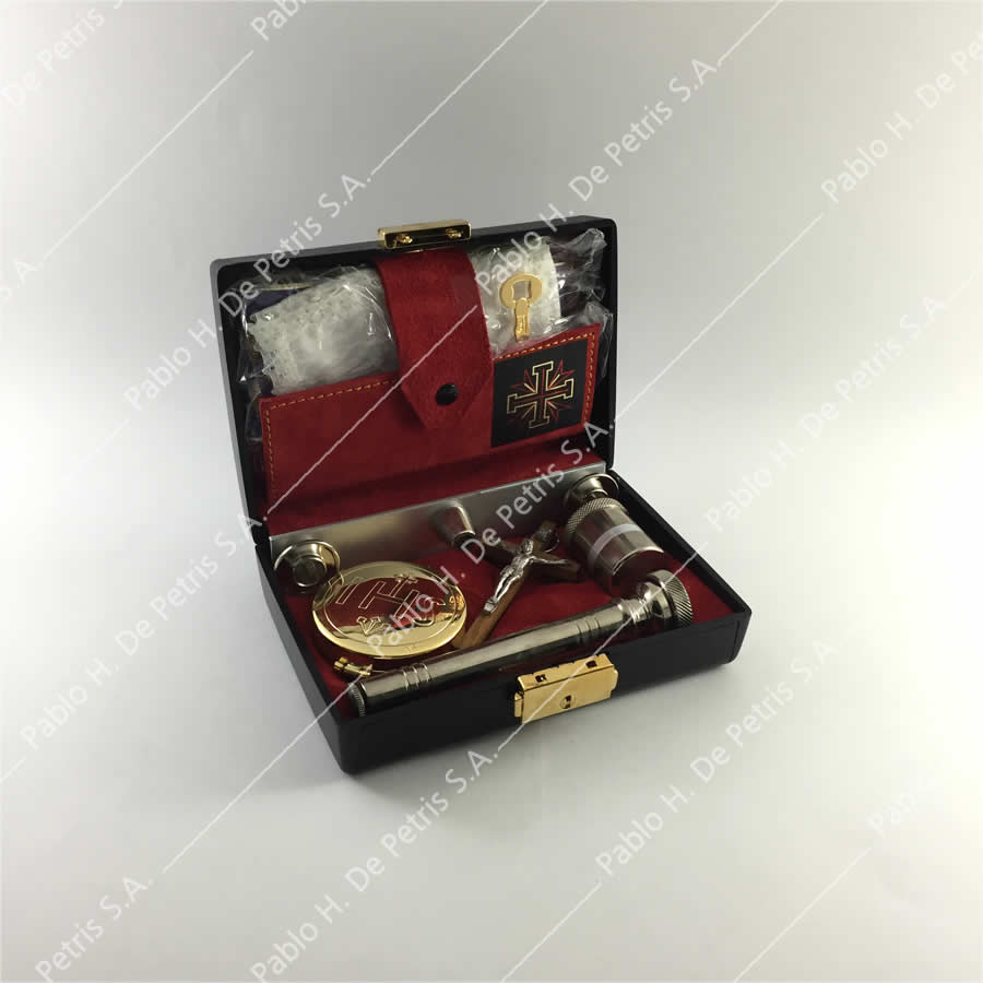 Estuche de cuerina compuesto por los siguientes elementos: 1 crimera, 1 aspersor, 1 teca, 1 cruz, 1 base para velas y cruz, 1 estola de bolsillo y 1 palia.