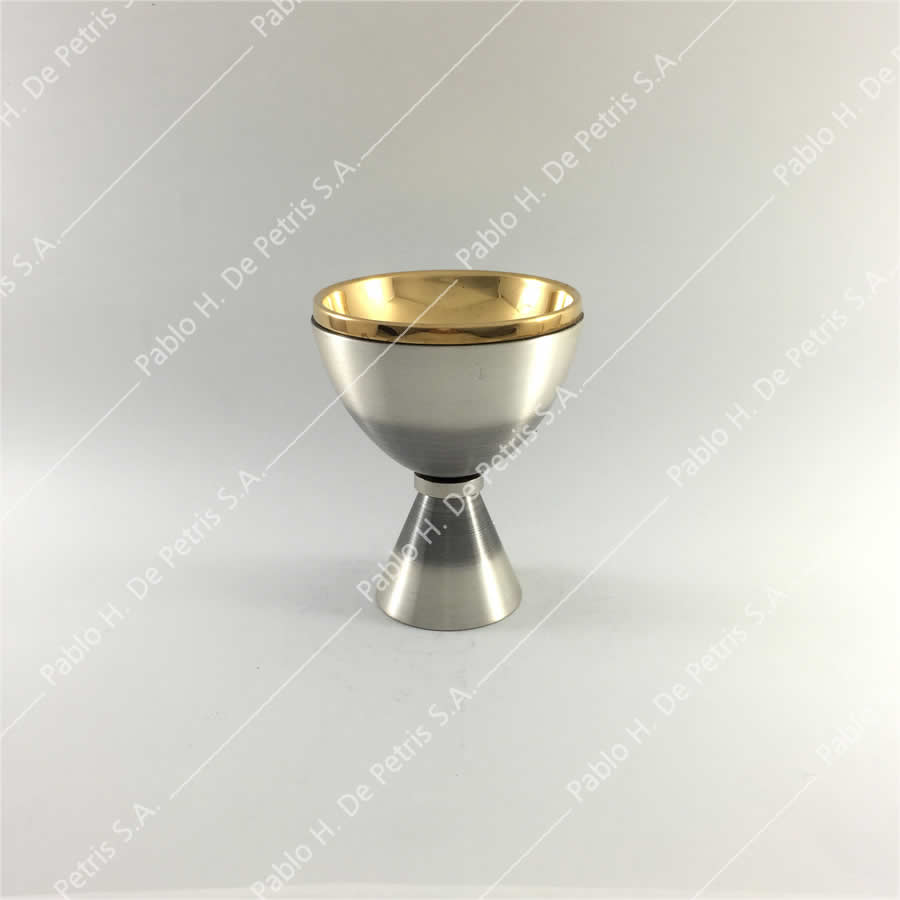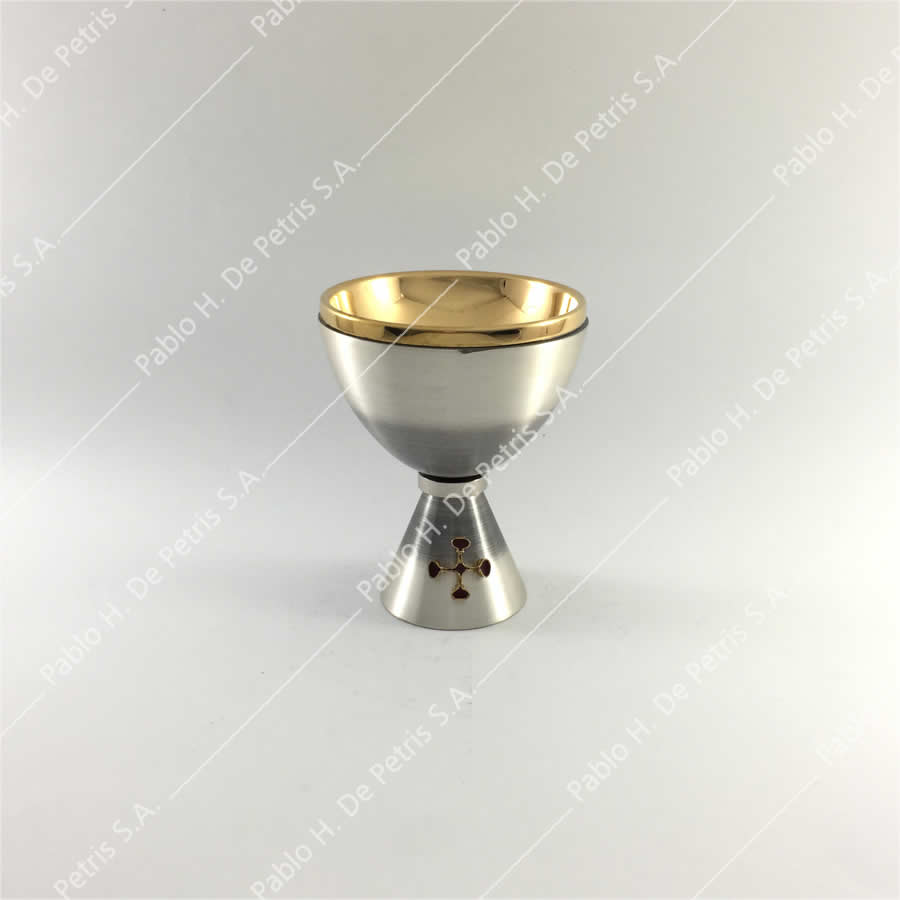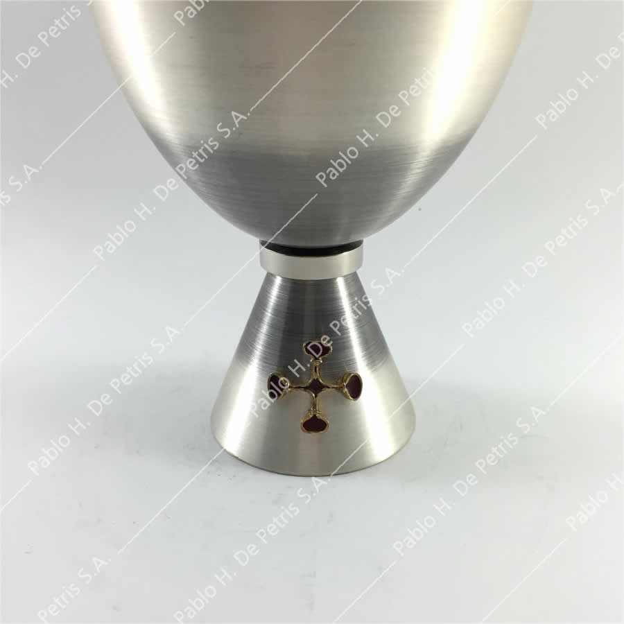 Realizado en bronce con interior y borde de la copa bañado en oro. Exterior bañado en plata en dos tonos. Cruz en esmalte horneado.