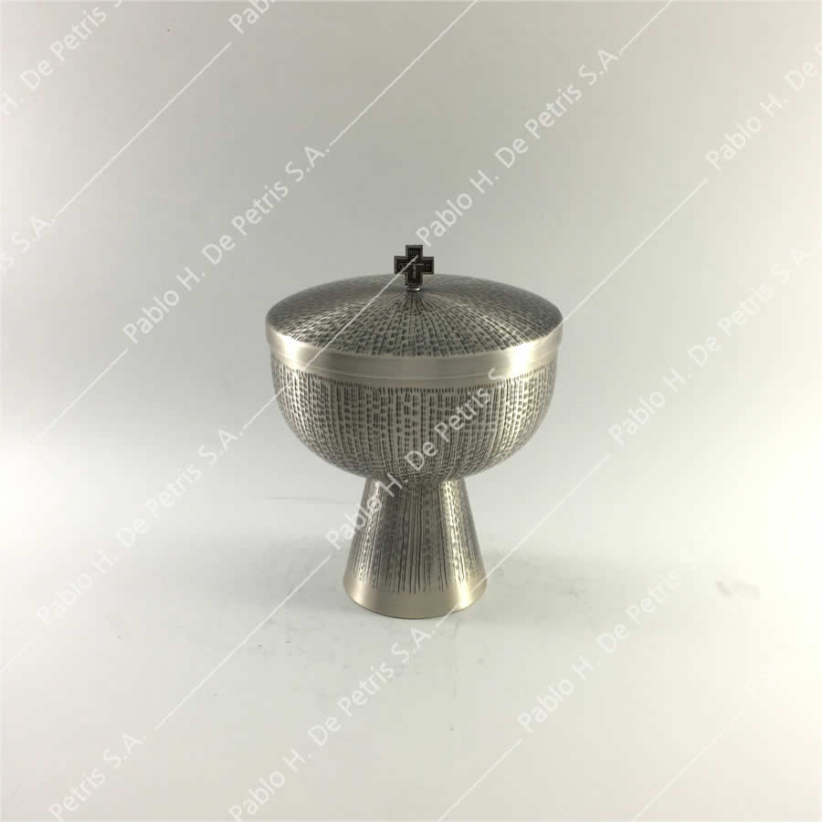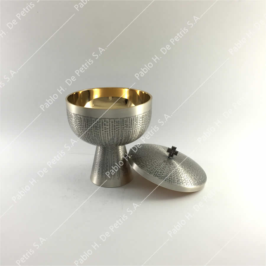 Copón realizado en bronce. Interior y exterior bañados en oro. Exterior bañado en plata con trabajo cincelado a mano.