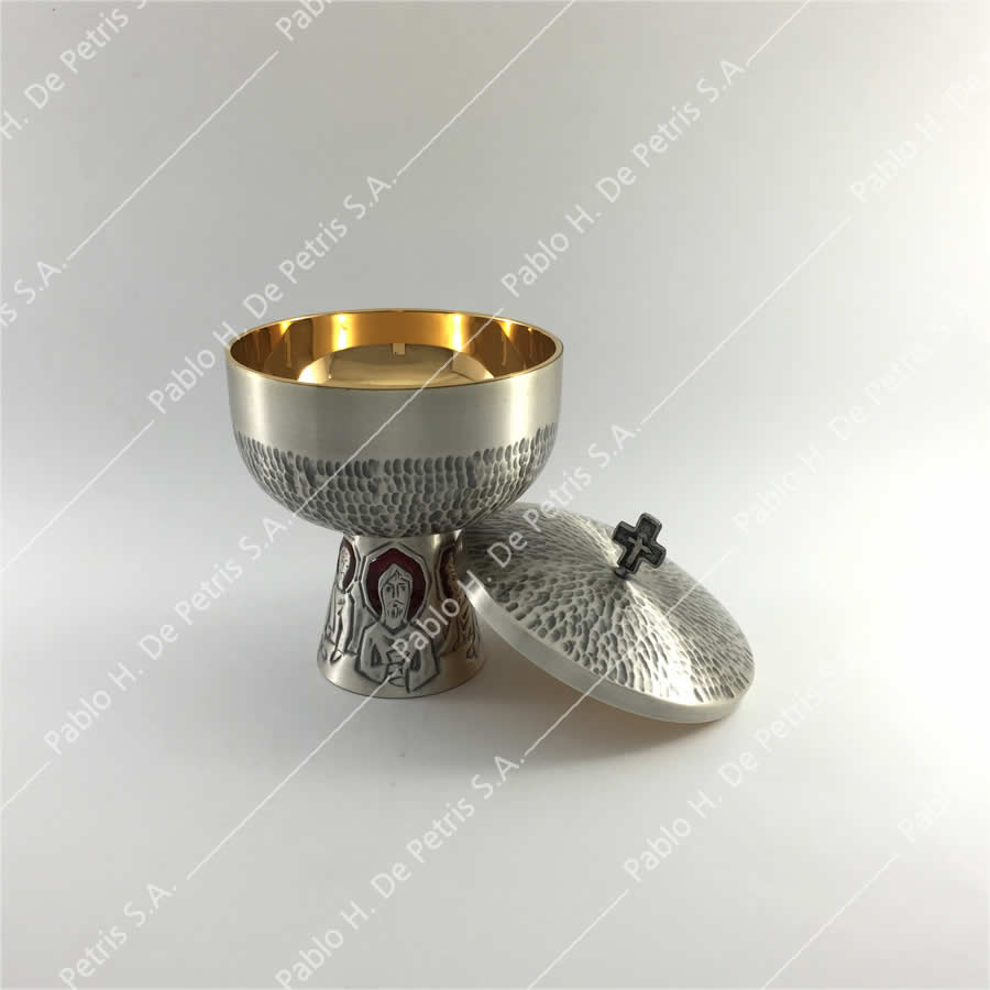 Realizado en bronce con interior bañado en oro y exterior bañado en plata en dos tonos. Ornamentación cincelada y trabajada con esmaltes orneados.