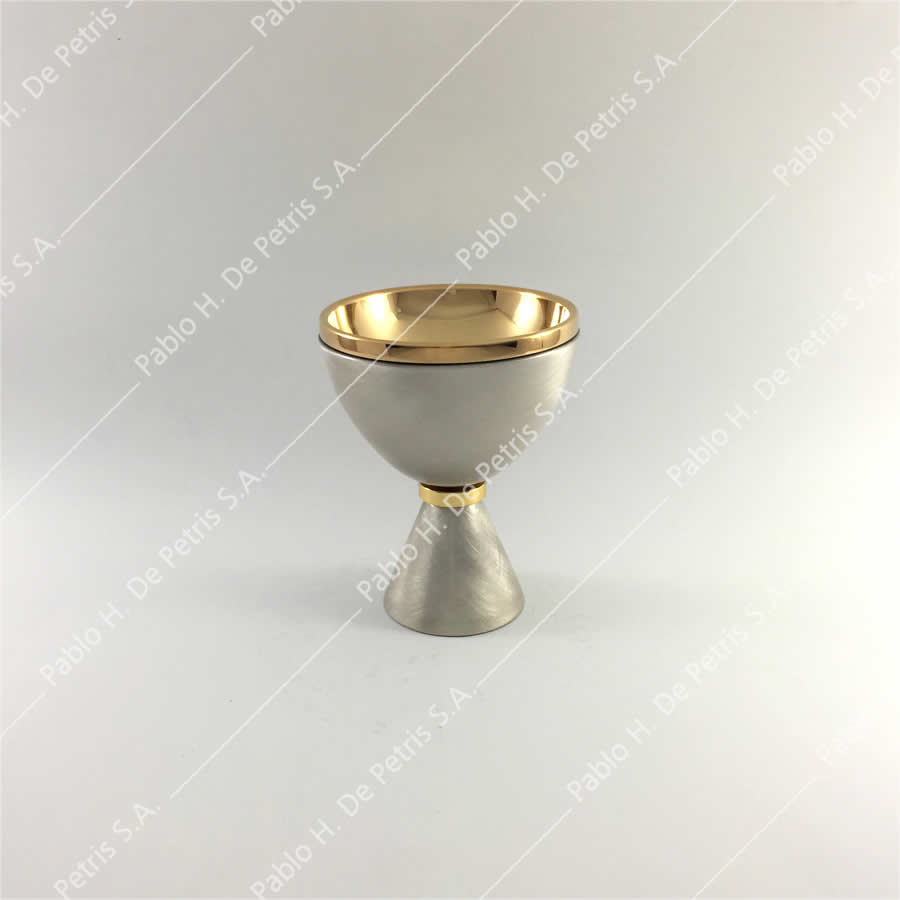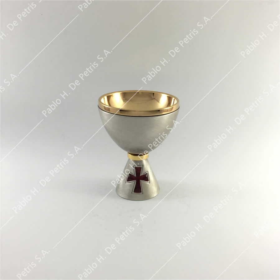 Realizado en bronce con interior y borde de la copa bañado en oro y exterior bañado en plata. Cruz en esmalte horneado.