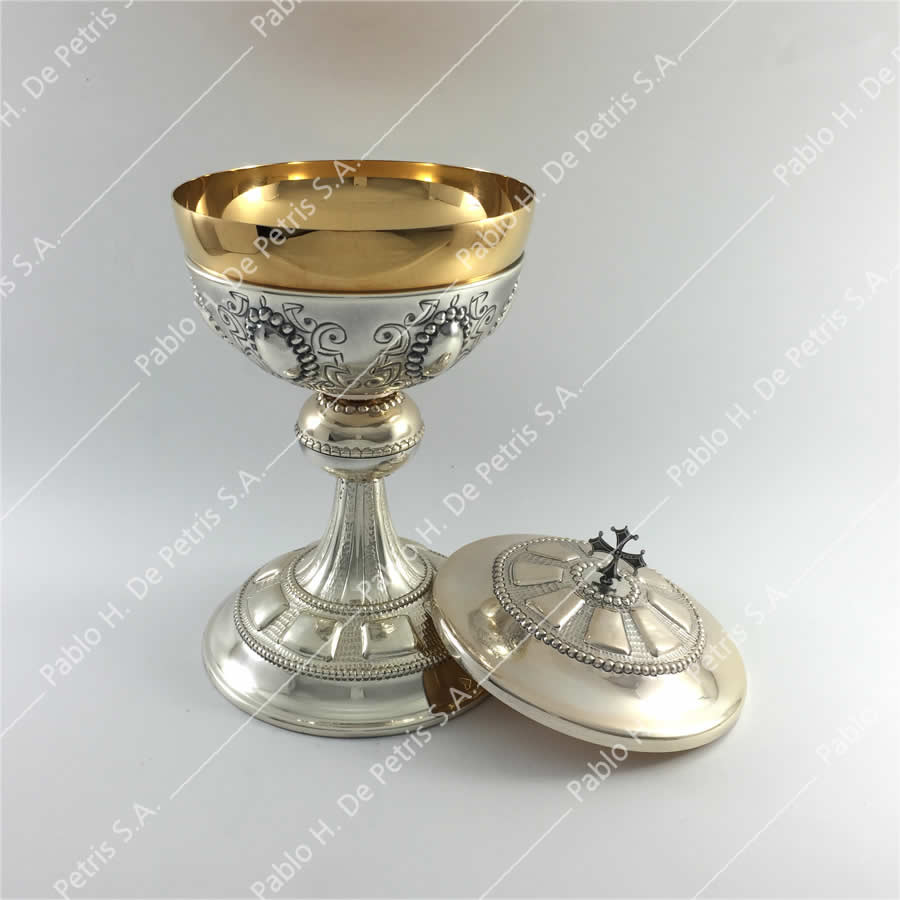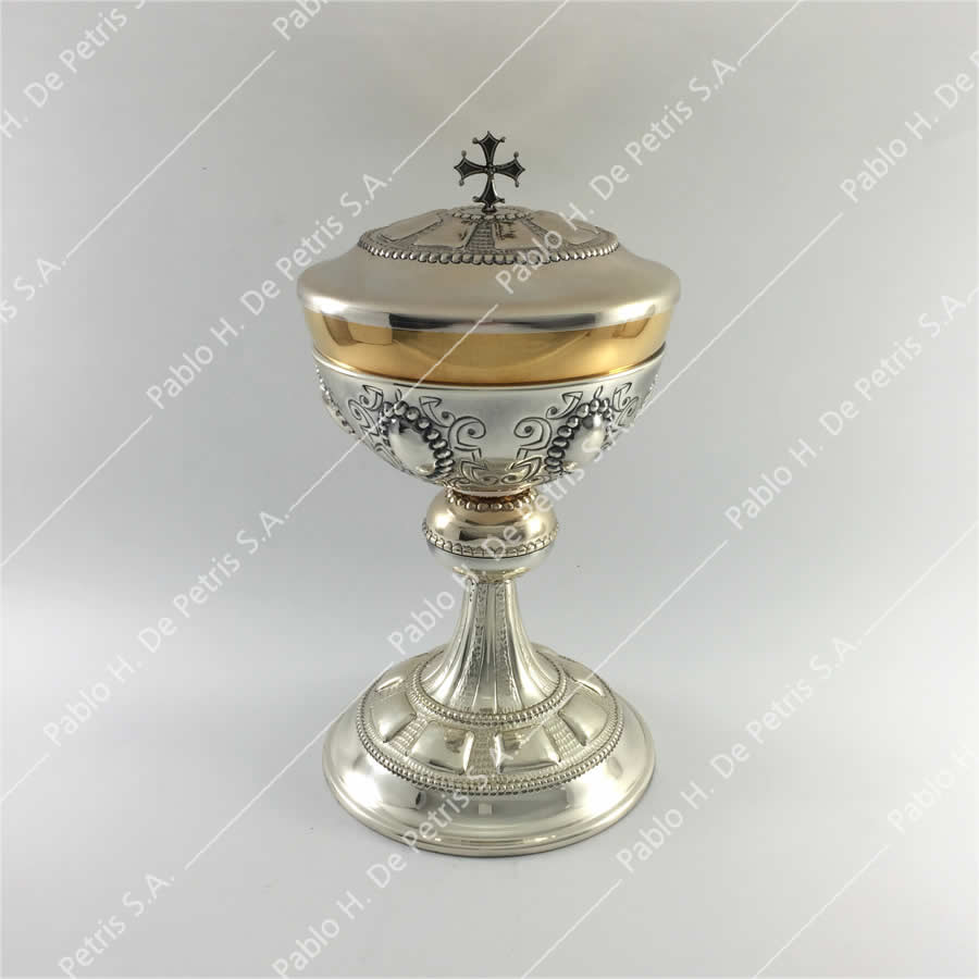 Copón realizado en bronce. Interior bañado en oro y exterior bañado en plata. Ornamentación cincelada a mano.