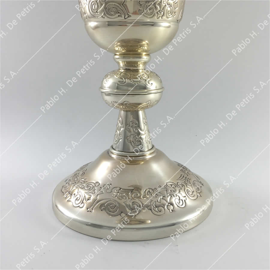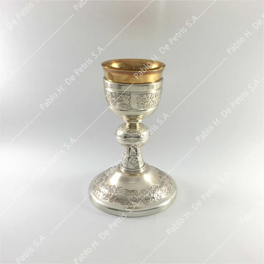 Cáliz con copa de plata bañada en oro. Nudo y pie realizados en bronce. Exterior bañado en plata cincelado a mano.