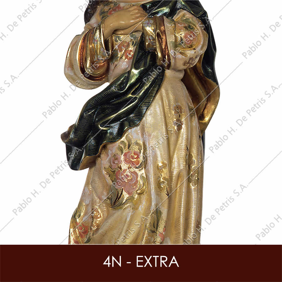 - 4N - Extra - Sobre la decoración 4E, los ropajes tienen hermosos dibujos al cincel., imitando tisú y ricos bordados. Peana dorada, bruñida y cincelada.