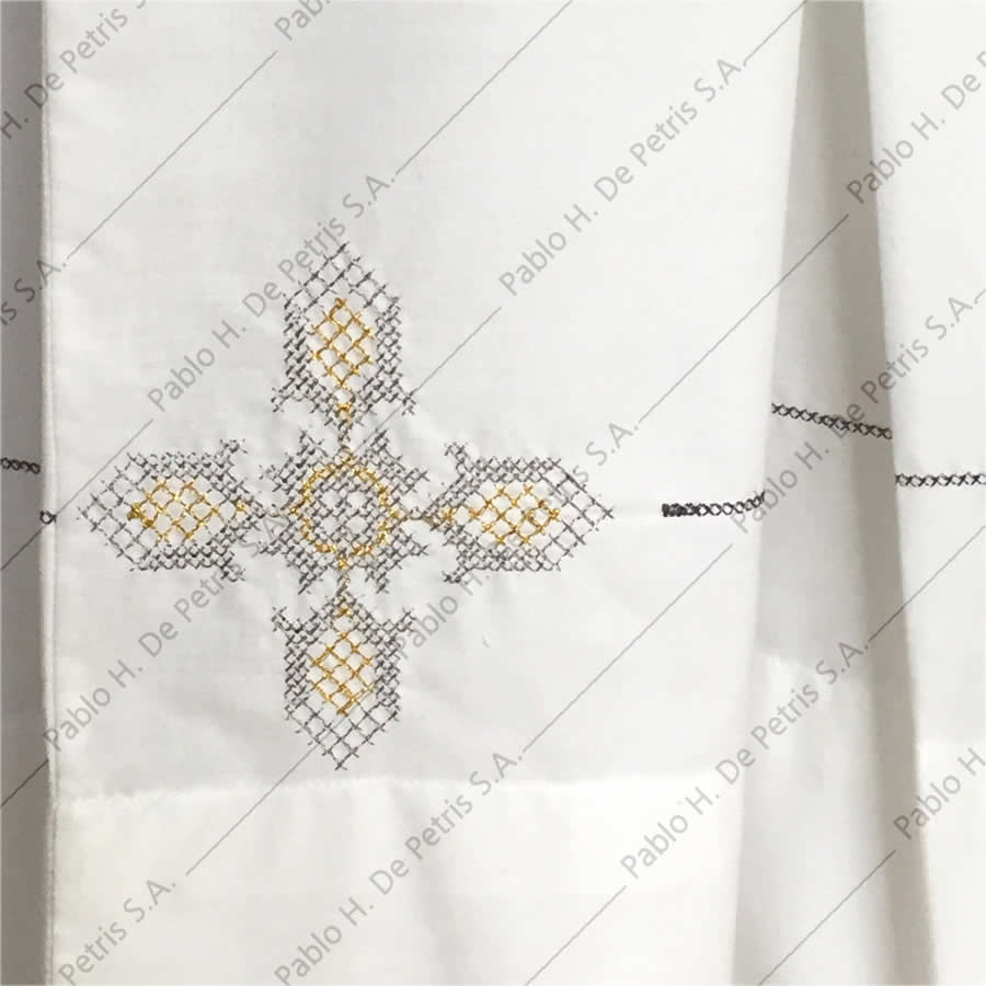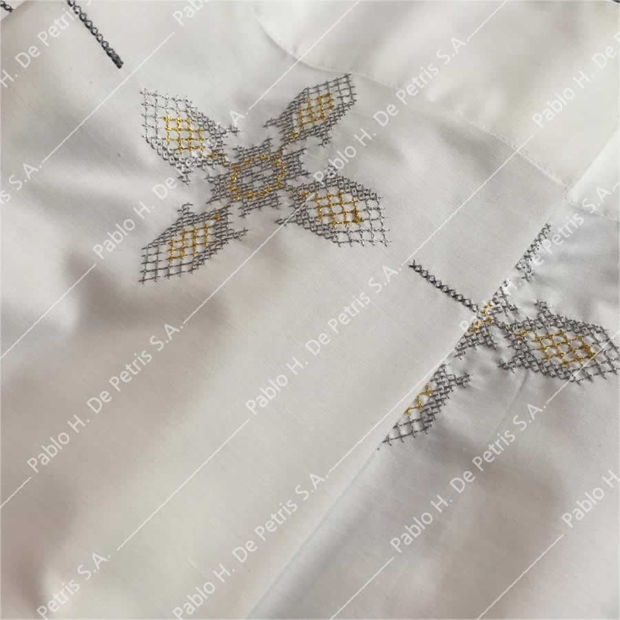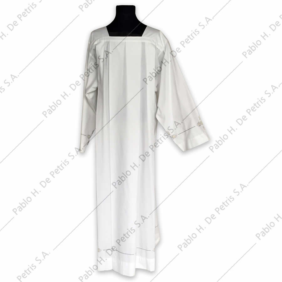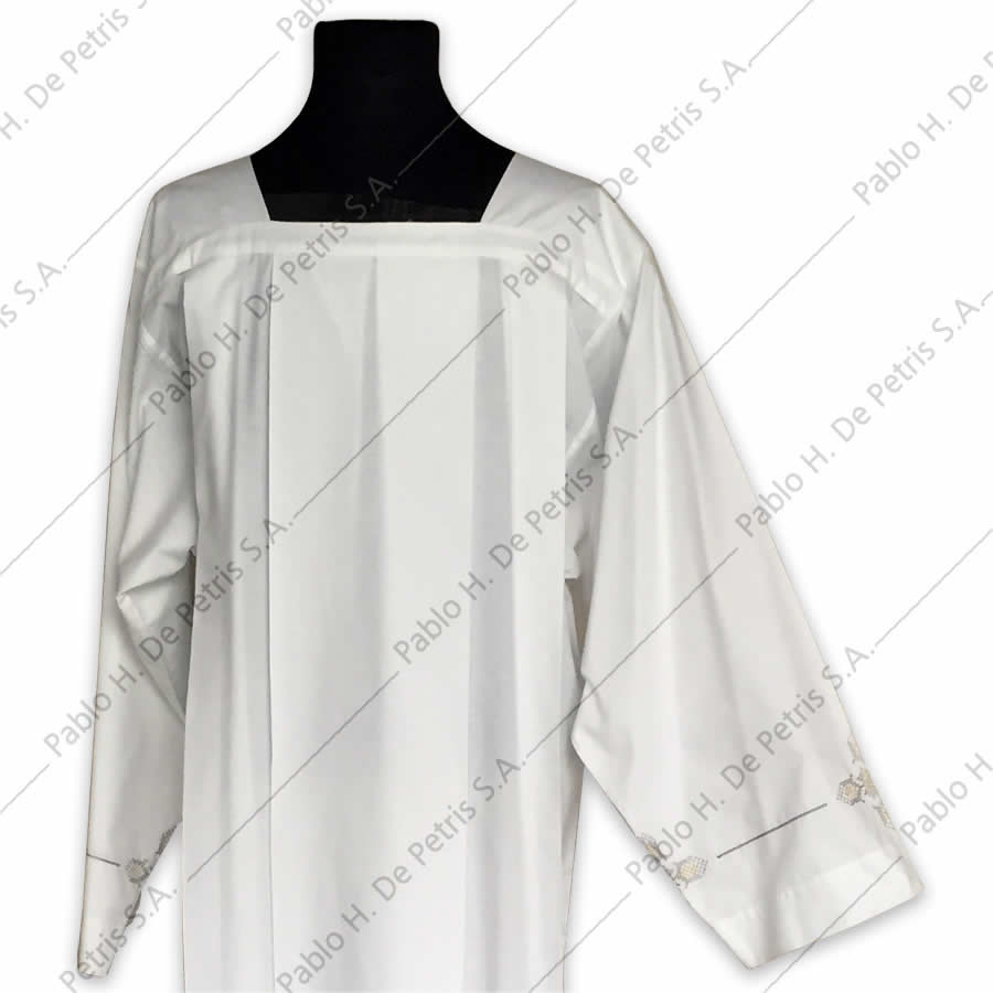 Realizada en mezcla de tejido natural y sintético. Modelo para amito con mangas y borde inferior ornamentados con hilados de diseños litúrgicos.