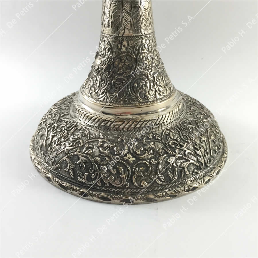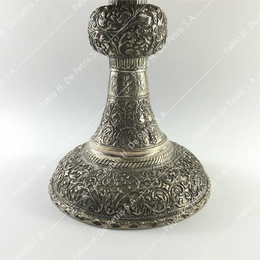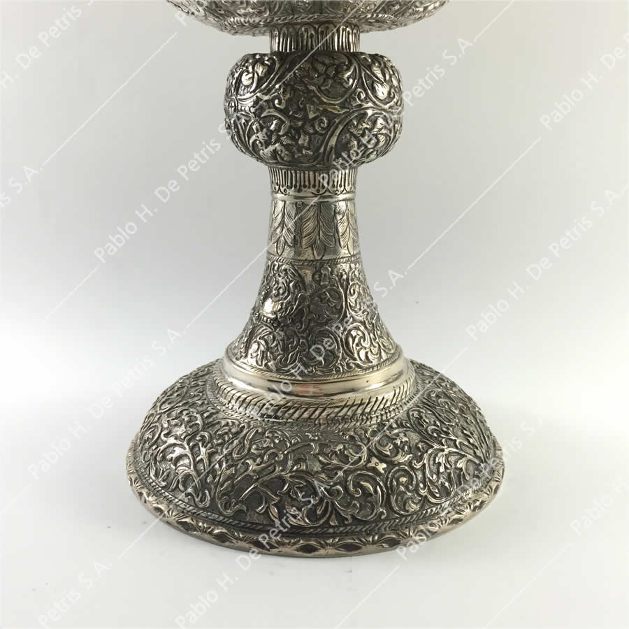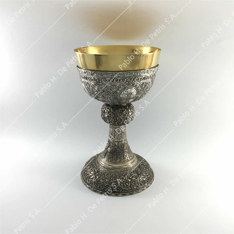 Cáliz de plata con exquisito trabajo cincelado a mano que abarca toda la pieza. Interior y borde exterior de la copa bañados en oro.