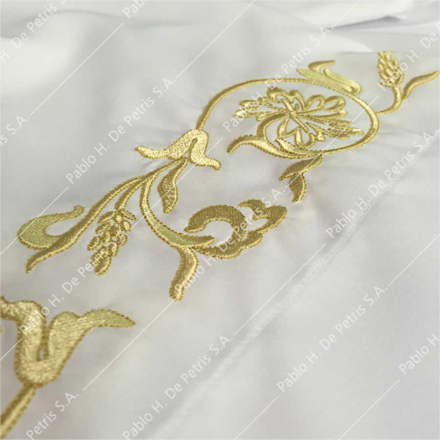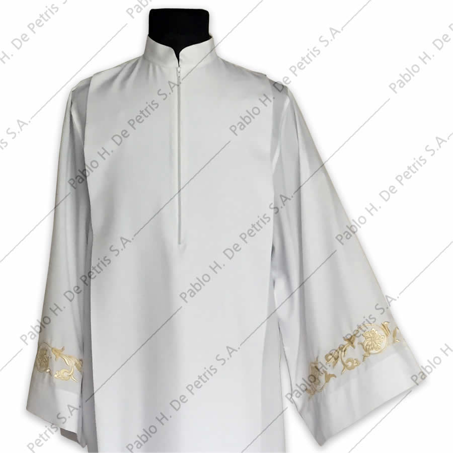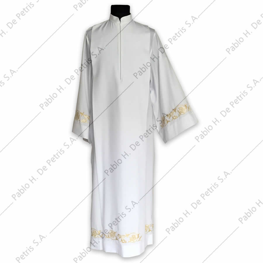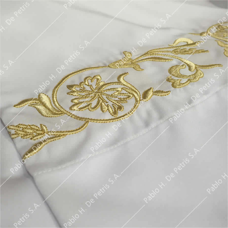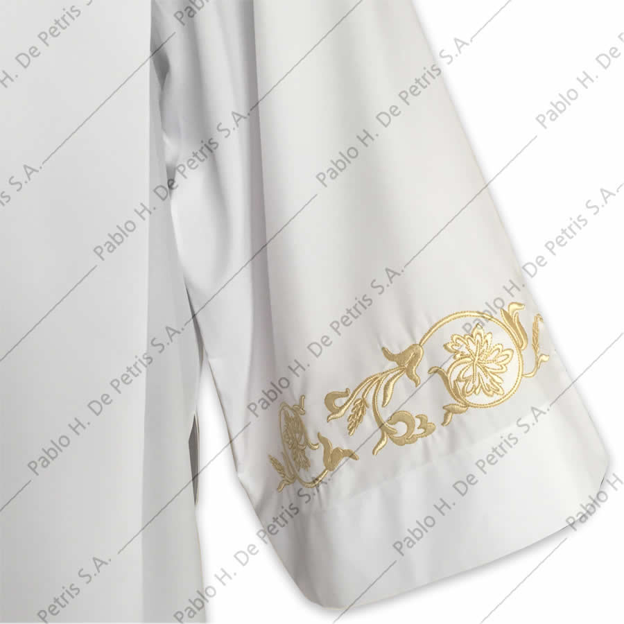 Alba con tablón. Realizada en mezcla de tejido natural y sintético. Mangas y borde inferior bordados con hilos dorados.