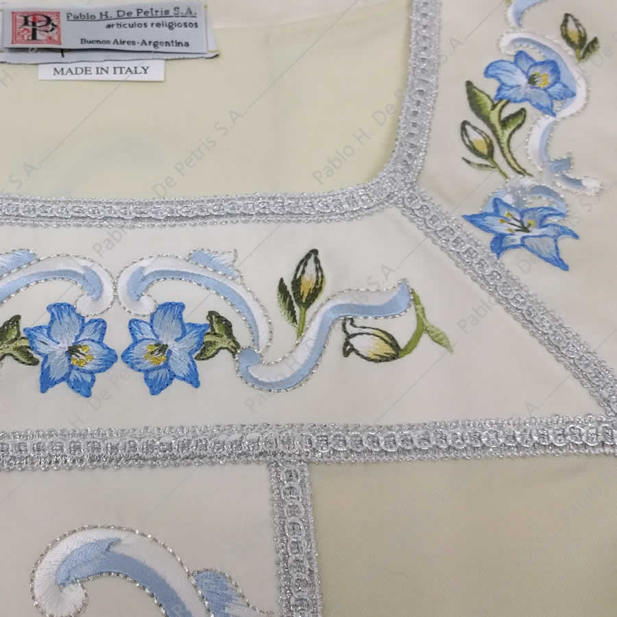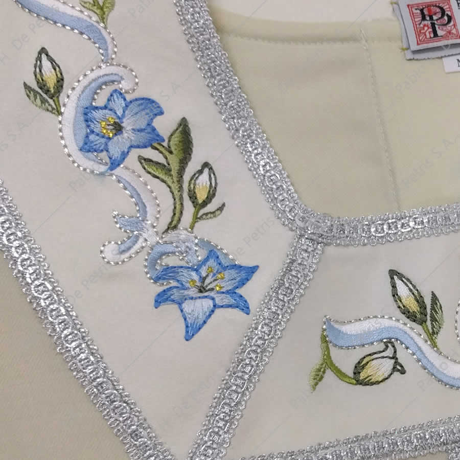 Ornamentada con un estolón bordado con motivos Marianos, al frente y a la espalda.