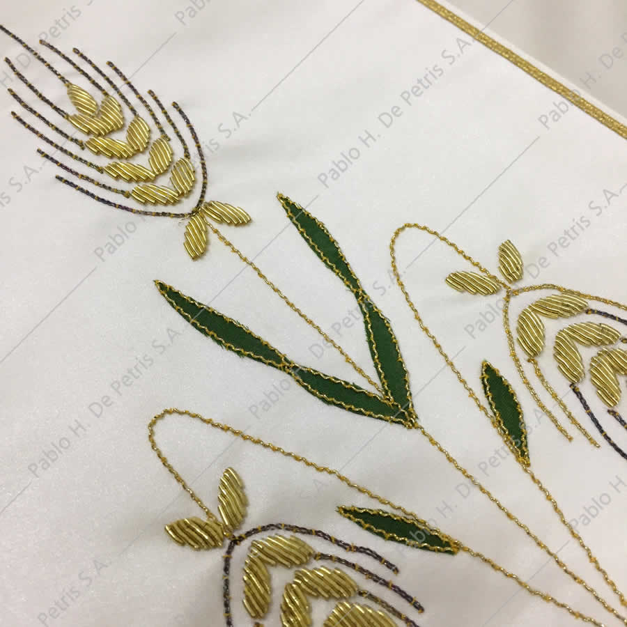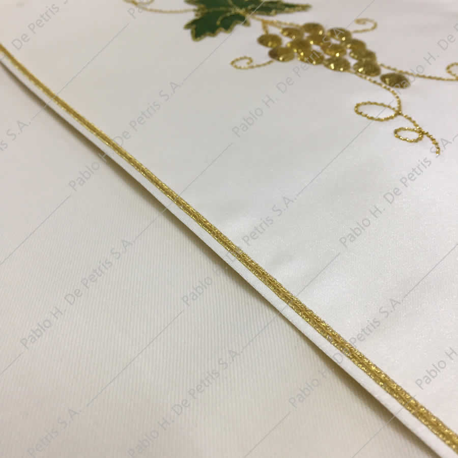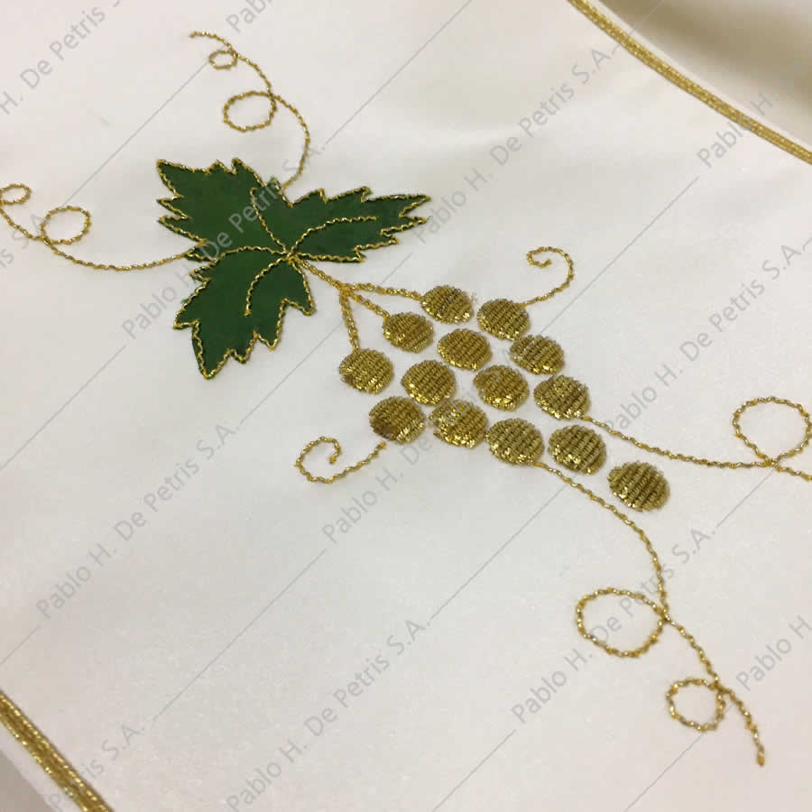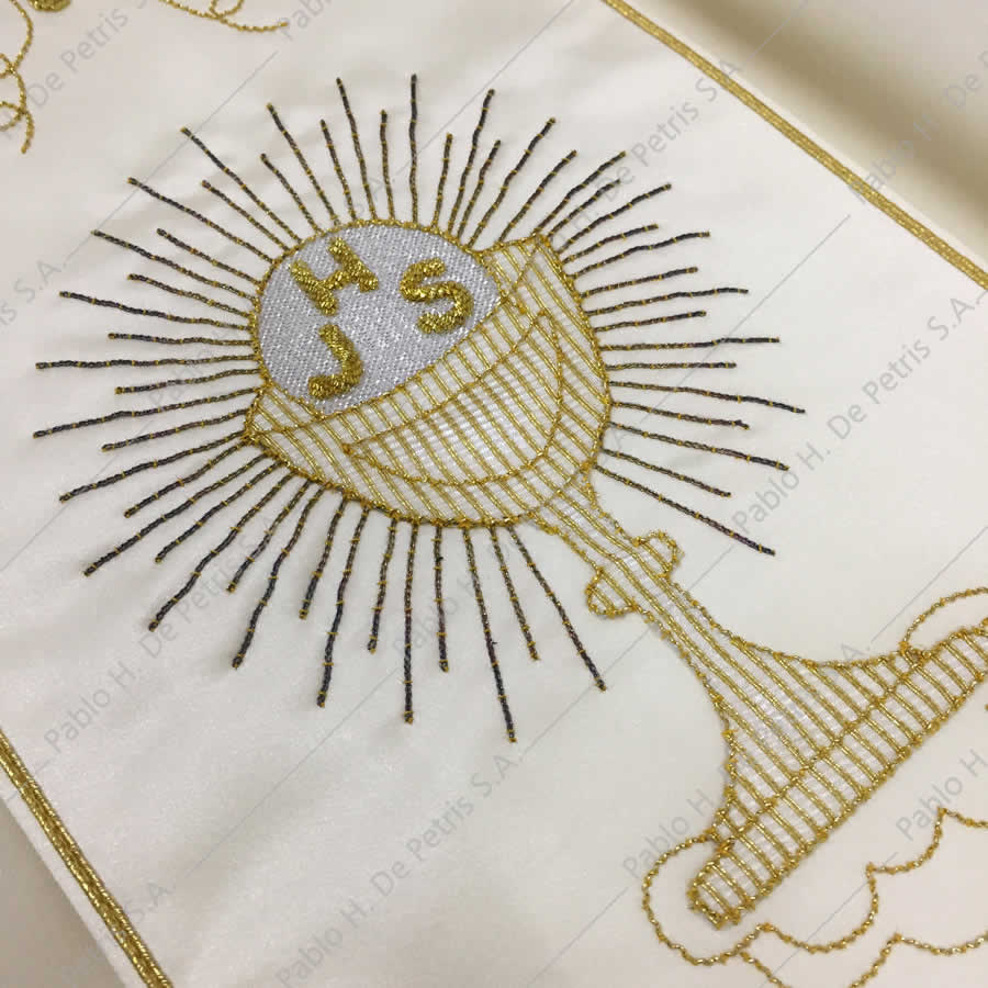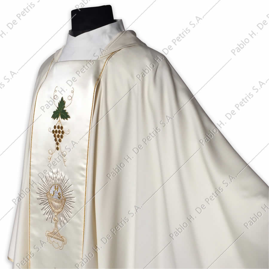 Casulla con estolón bordado a mano al frente y a la espalda.