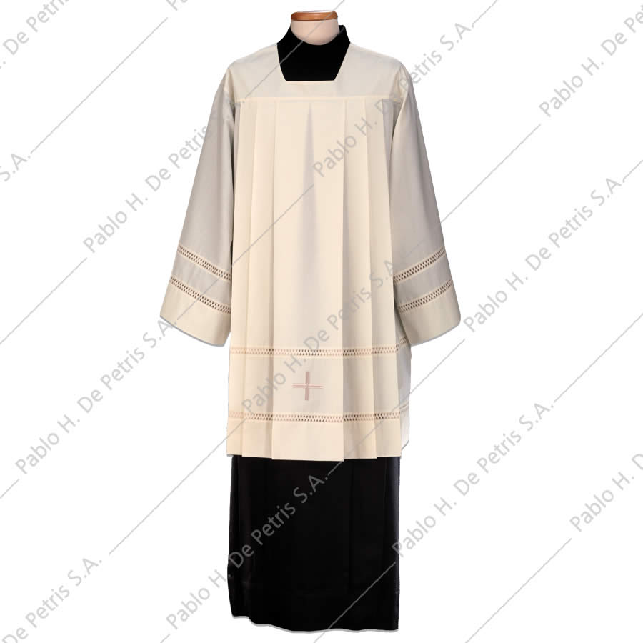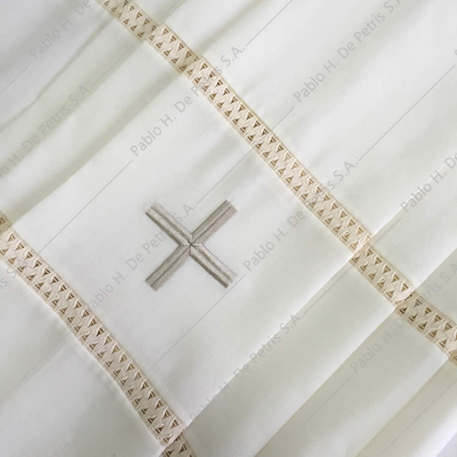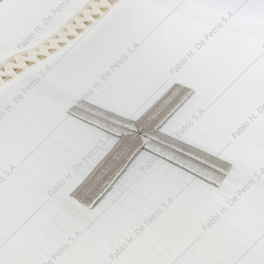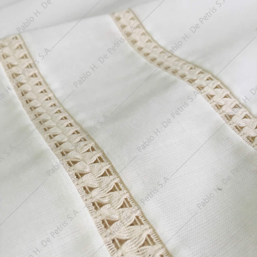 Realizado en tejido de poliéster y lana. Ornamentado con bordado y delicado entredos en sus extremos.
